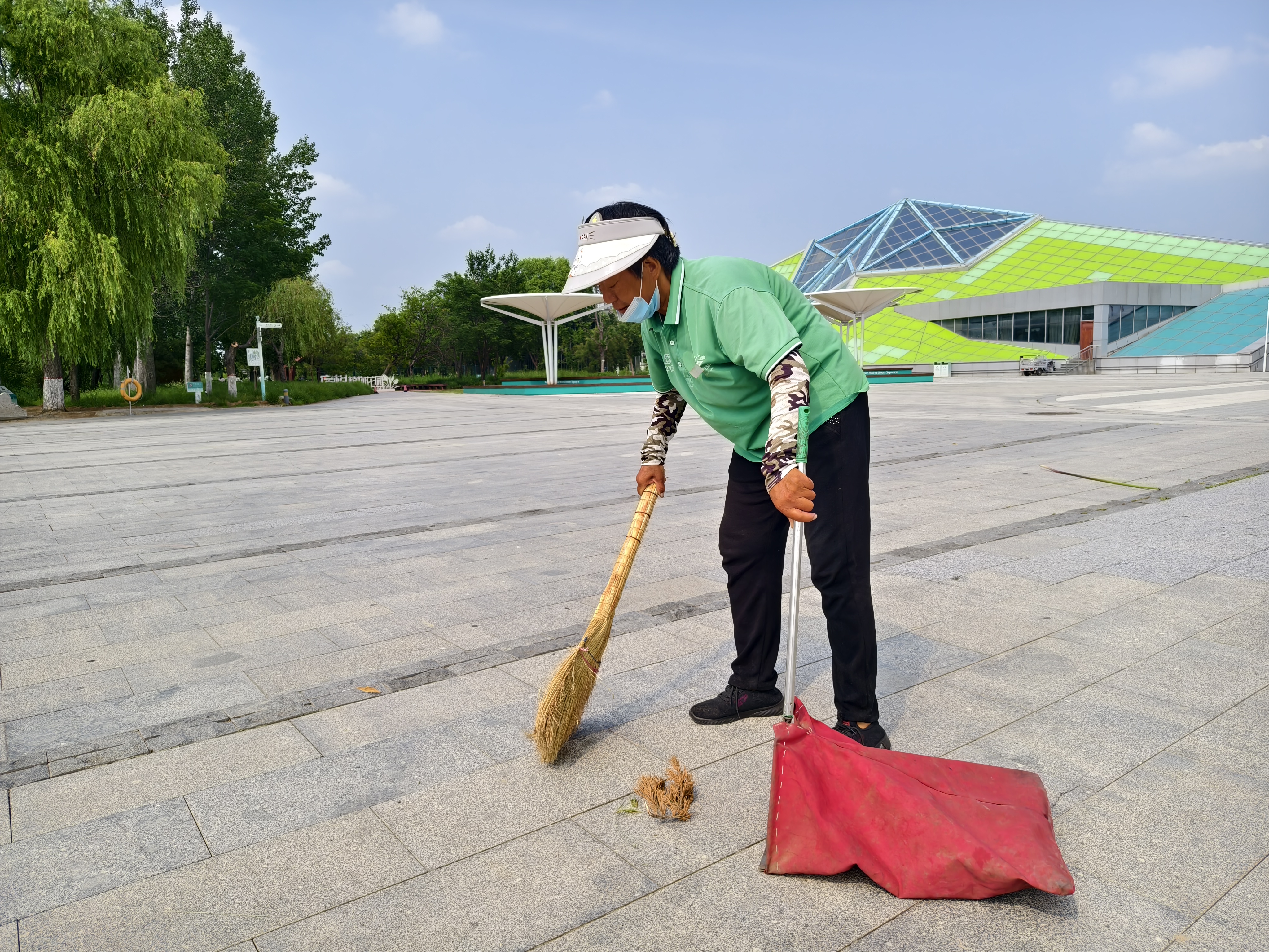 同一时间段,景区广场上,保洁人员霍秀根也没闲着。她戴着遮阳帽、口罩,一手拿扫帚,一手握簸箕,一下一下清扫着地面。“一天得来回跑10来趟,咱得让景区一直整洁着!” 霍秀根操着乡音说道。
