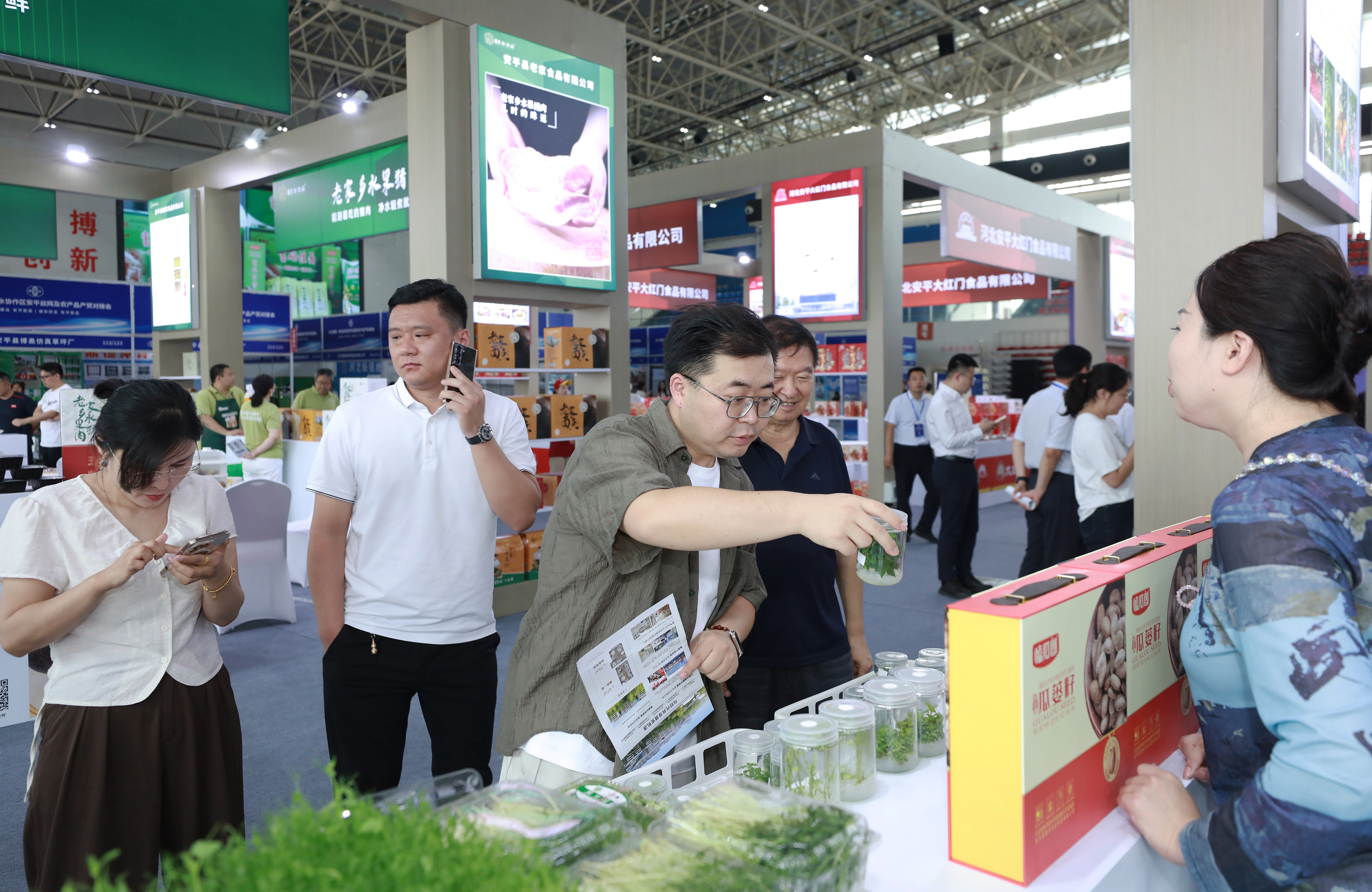 7月10日,2025雄安·衡水协作区安平丝网及农产品产贸对接会开幕式现场,观众正在展台前购买农产品。陈月振 摄