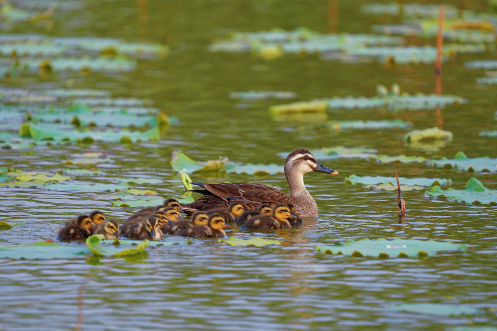 5月21日,衡水湖,一只斑嘴鸭带着一群小鸭宝宝在水中游弋嬉戏。周津摄