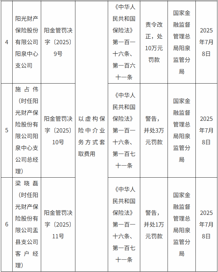 同时,时任阳光财险阳泉中心支公司总经理施占伟因以虚构保险中介业务方式套取费用,被警告,并处3万元罚款;时任阳光财险盂县支公司客户经理梁晓磊因以虚构保险中介业务方式套取费用,被警告,并处1万元罚款。