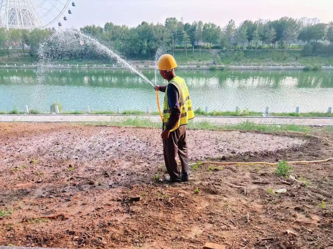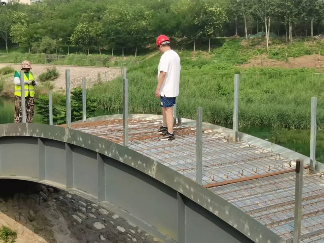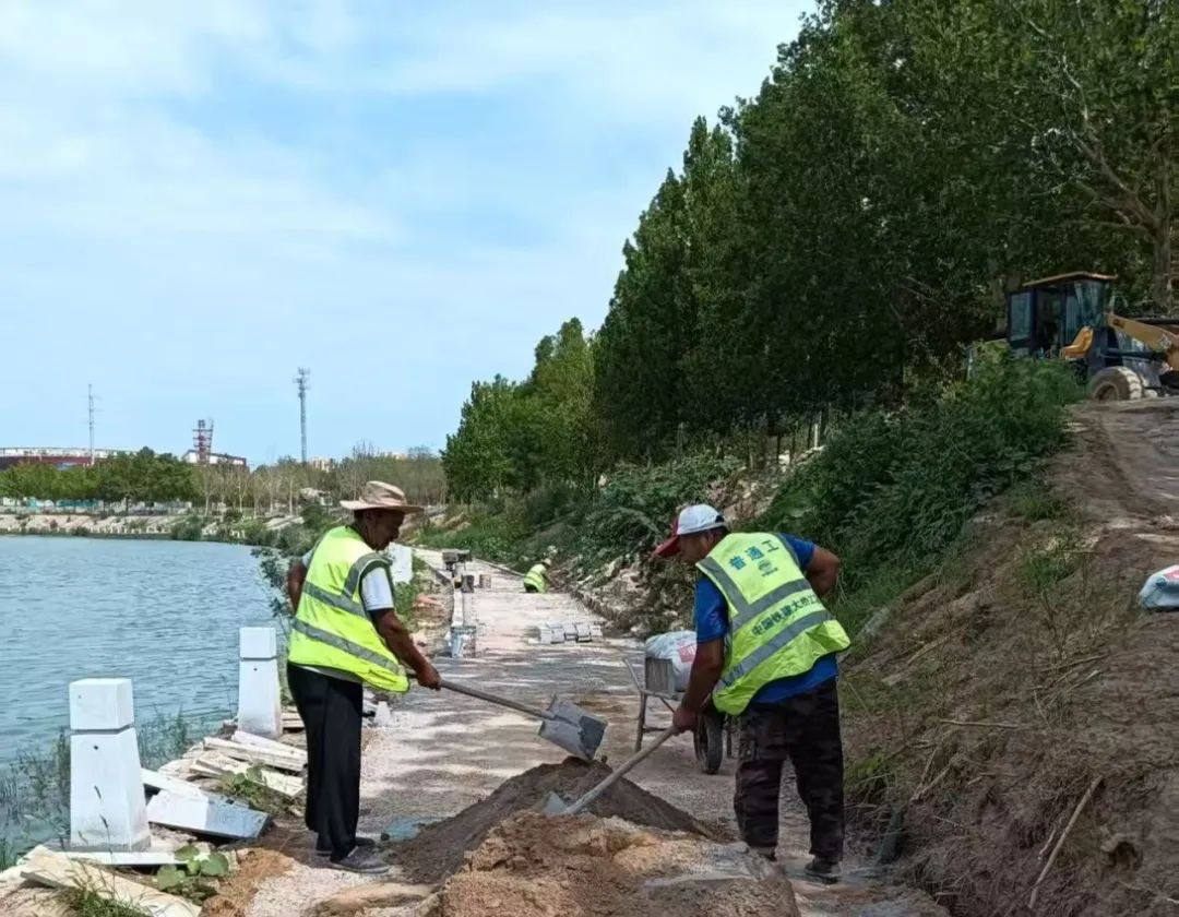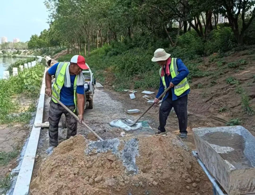 为确保按时完成节点任务要求,目前该工程多个施工面同步推进。加紧进行破损道路修复、人行道透水基层施工、路缘石安装,全力推进园路边石安装、驳岸栏杆桩安装及盖板铺装,持续开展海绵乔木和地被的种植与养护,抓紧推进剩余的路灯基础施工,路灯也在紧锣密鼓地加工安装,正有序进行交通桥面钢筋绑扎,便民驿站正开展抹面施工。