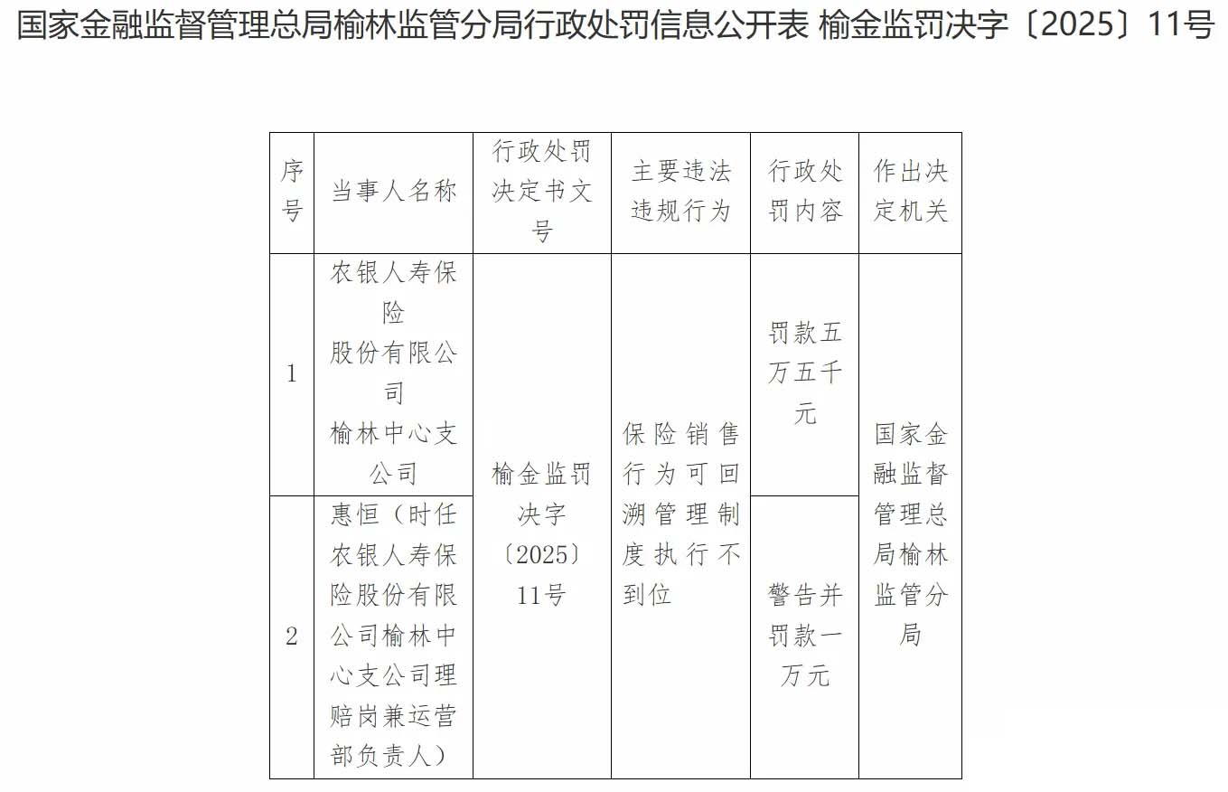 7月7日,国家金融监督管理总局榆林监管分局行政处罚信息公开表显示,农银人寿保险股份有限公司(下简称“农银人寿”)榆林中心支公司因保险销售行为可回溯管理制度执行不到位,被罚款五万五千元。