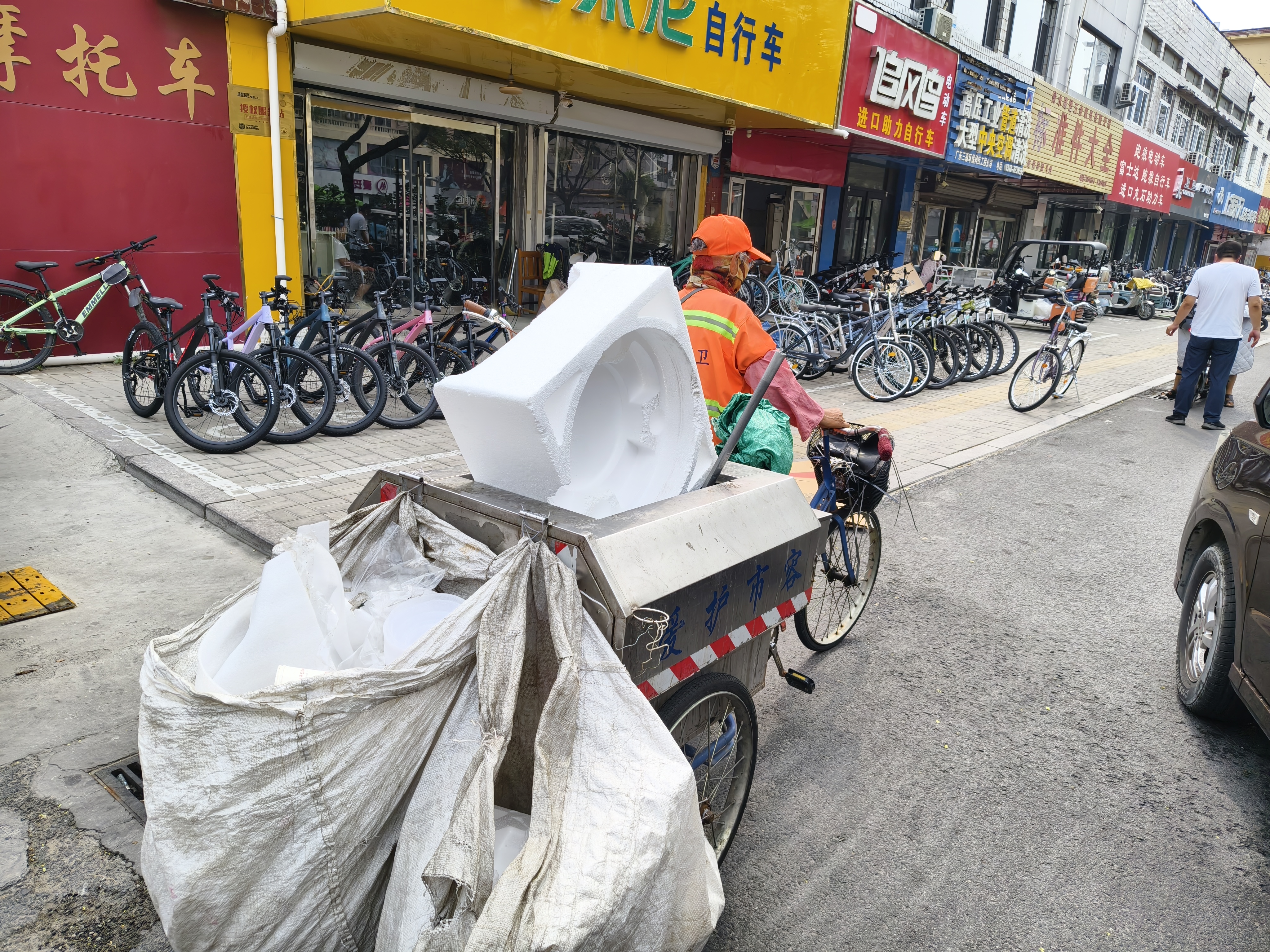 从榕花大街新华东路到和平东路来回一趟有600多米,忙的时候他一天要骑着保洁车跑将近20趟,脚步匆匆,几乎没有停歇的间隙。谈到防暑保障时,刘大爷指了指保洁车一侧的小抽屉:“单位每到夏季都贴心给我们备足了补给——藿香正气水、风油精、仁丹,感觉不对劲就赶紧用上。”谈话间,他拧开随身带的水壶想喝口水,却发现壶内早已空空,中午出门刚灌满的一壶白开水,在烈日的“高温战”下已“弹尽粮绝”。好在许多热心商家总会招呼他们进去打水,公共卫生间内也有直饮水装置,“渴了随时能喝上水,大家伙都挺照顾我们的。”
