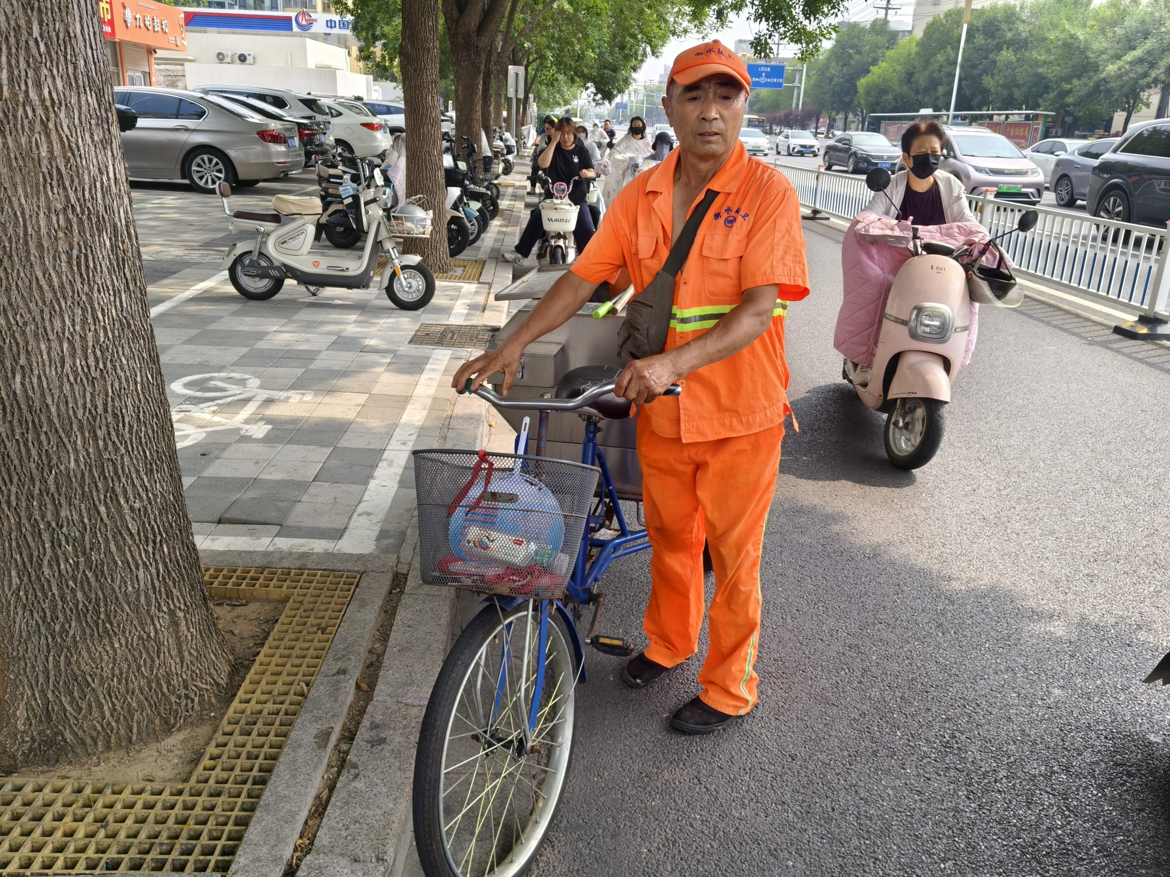 话音未落,他的目光已锁定一个被丢弃的塑料袋,立刻推车走去,弯腰、清扫、起身,动作熟练麻利,汗珠也再次顺着脸颊滚落,滴入他脚下这片誓要守护洁净的“战场”。