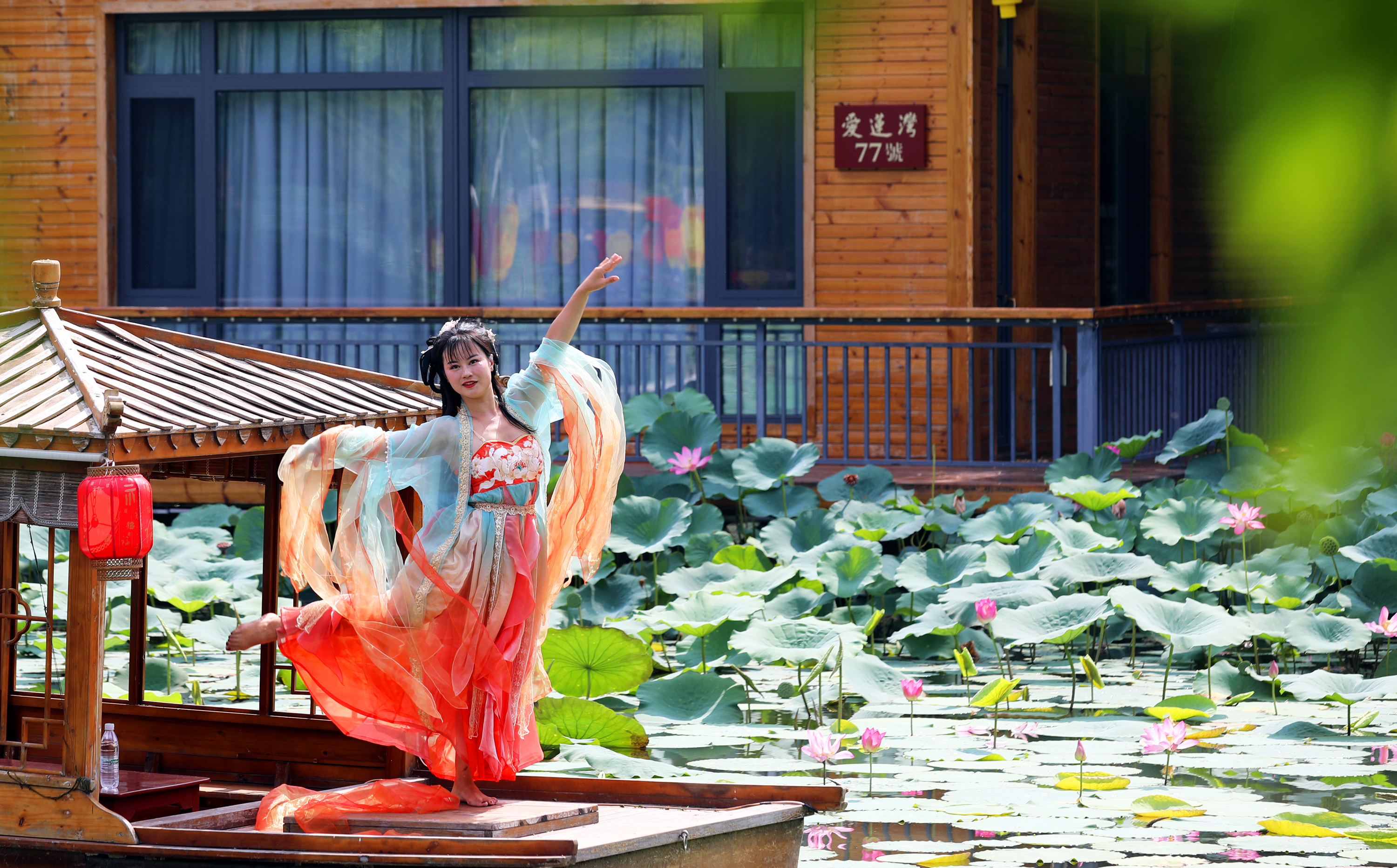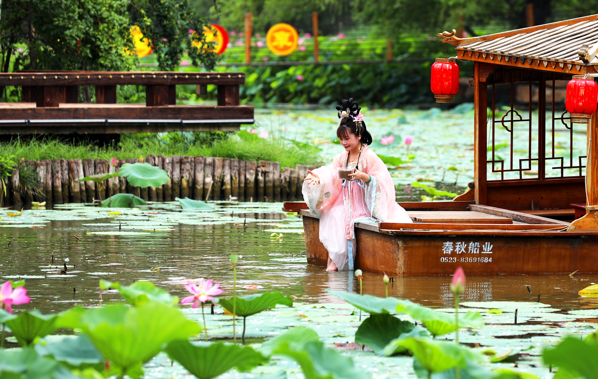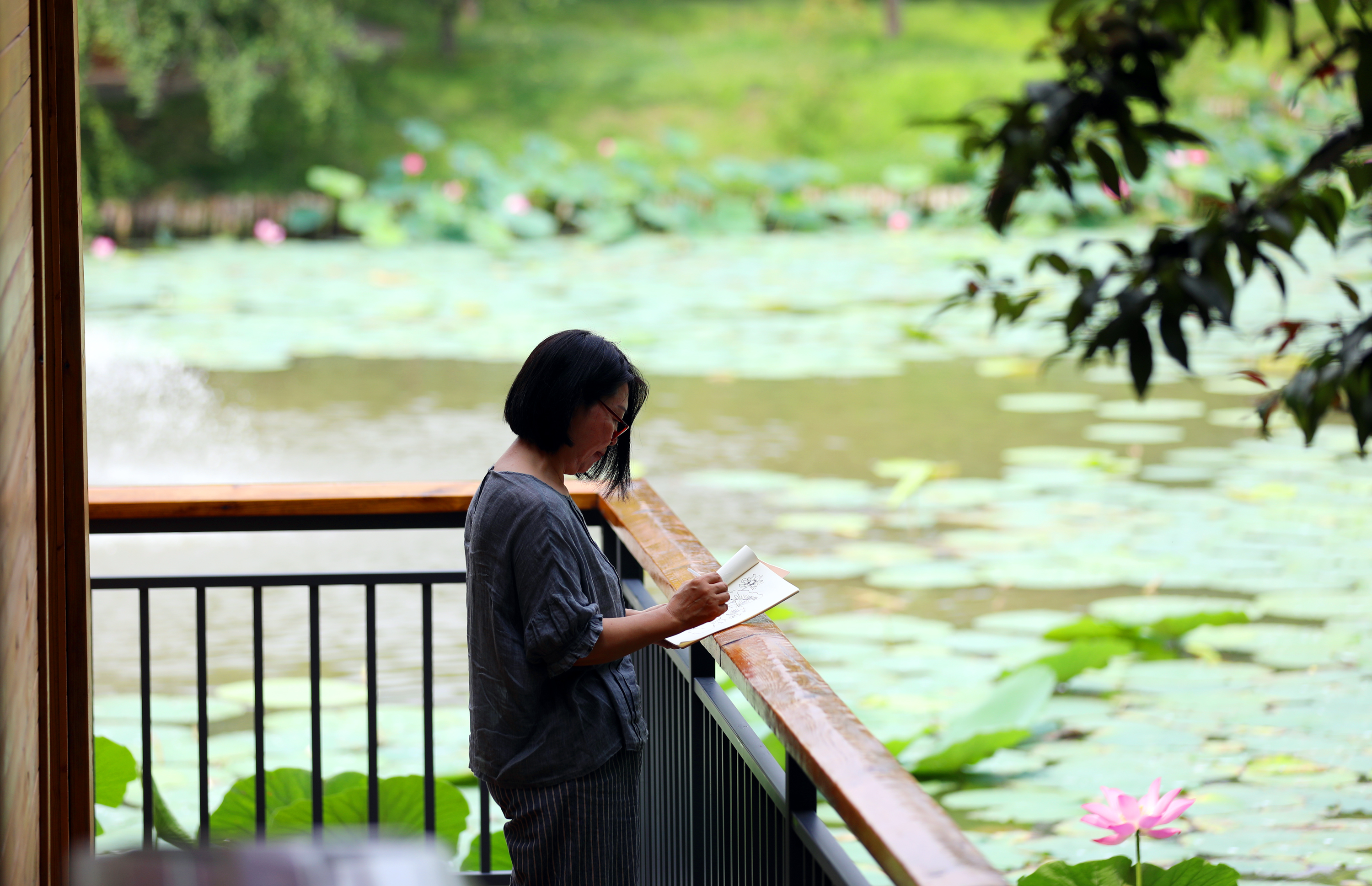 除普通游客外,这片荷塘还吸引了不少特殊的“访客”。水塘中,身着古装的姑娘在摄影师指导下,以荷花为背景拍摄古风写真,水绿襦裙、藕粉广袖与荷花相映成趣;不远处,写生爱好者专注作画,试图将荷塘美景连同岸边笑语、水中鱼影一同收进画中。