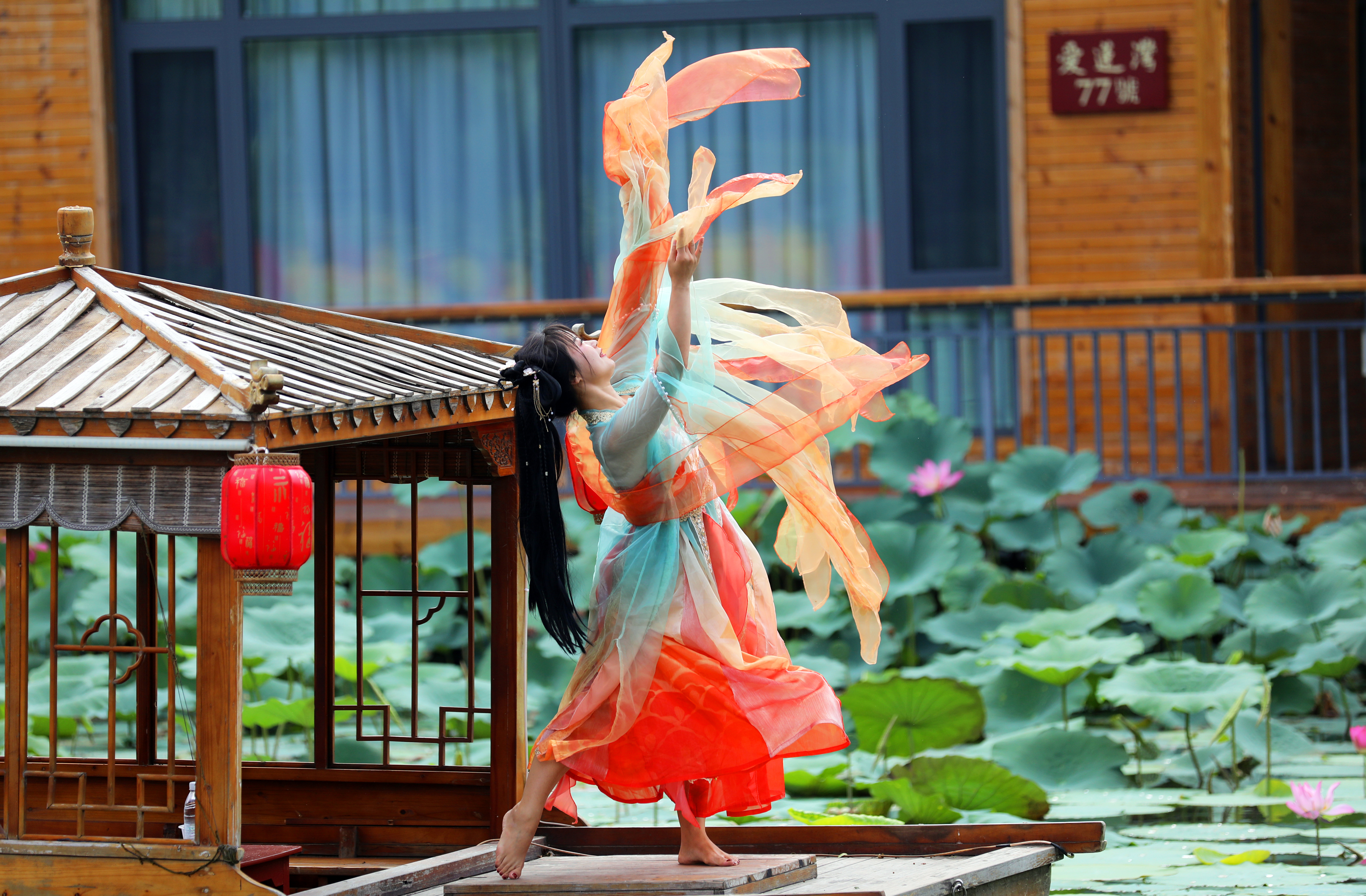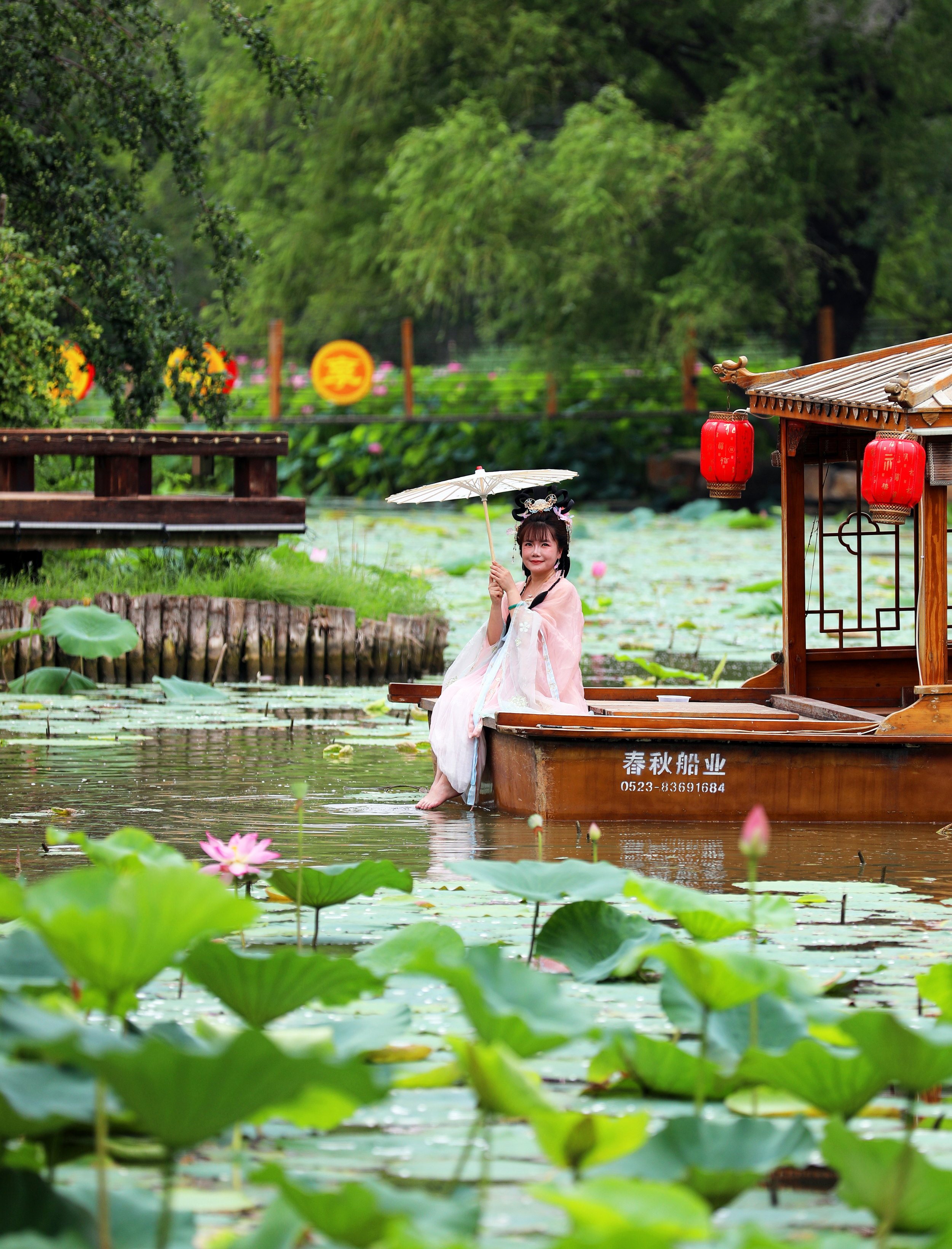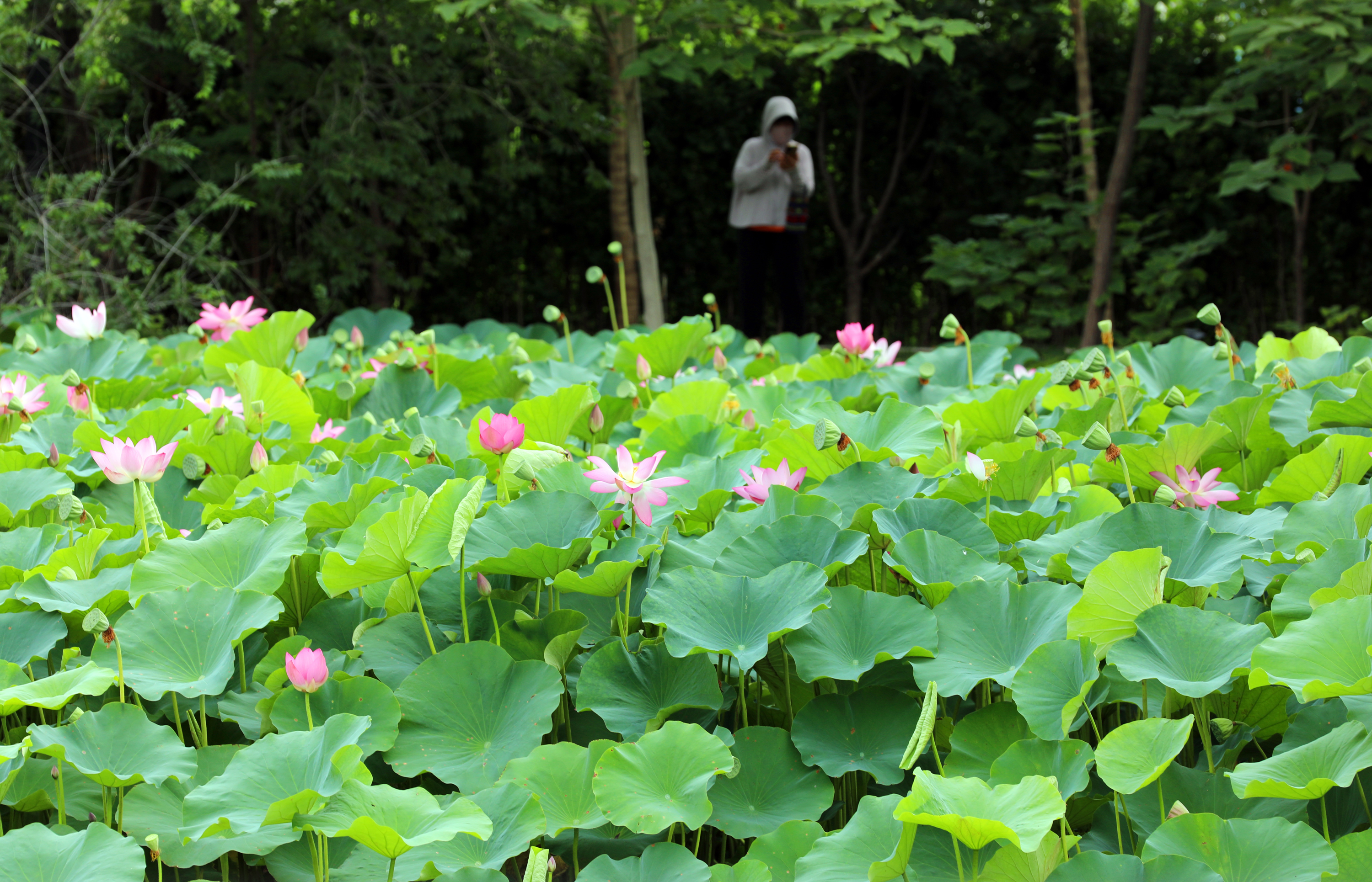 除普通游客外,这片荷塘还吸引了不少特殊的“访客”。水塘中,身着古装的姑娘在摄影师指导下,以荷花为背景拍摄古风写真,水绿襦裙、藕粉广袖与荷花相映成趣;不远处,写生爱好者专注作画,试图将荷塘美景连同岸边笑语、水中鱼影一同收进画中。