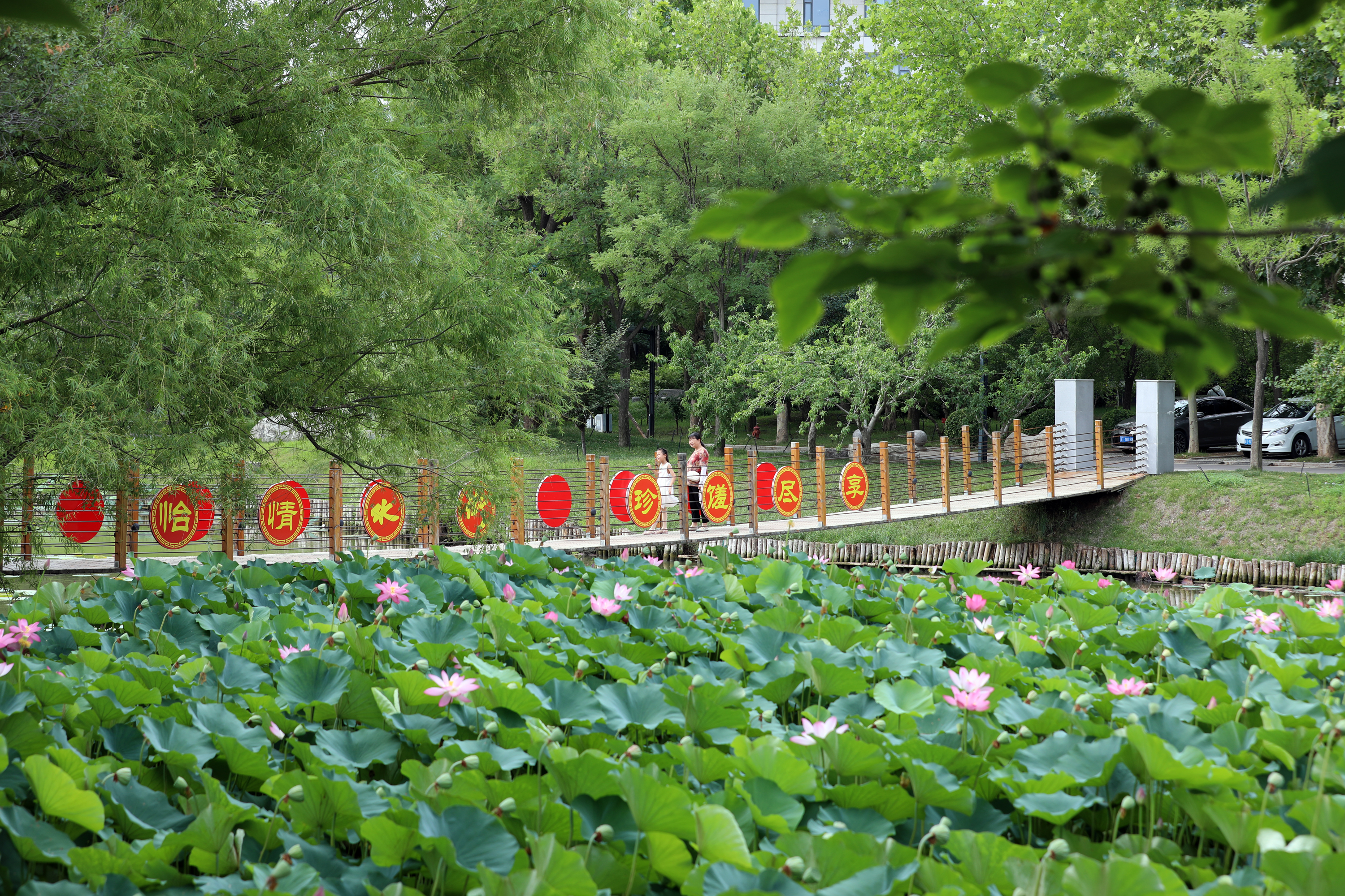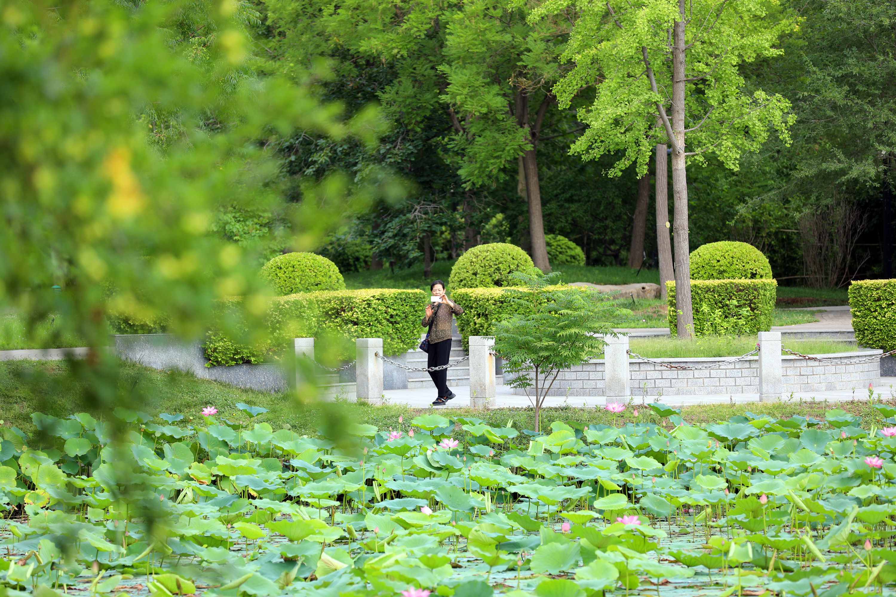 荷塘边游人如织,市民与游客皆沉浸在这美丽景色中。有的家长带着孩子,指着荷叶上的露珠,教孩子吟诵“小荷才露尖尖角”的诗句;有的手持手机,追逐荷花的倩影拍照留念,微风拂过青草,惊起的蜻蜓又轻轻落在花梗上,构成生动画面。