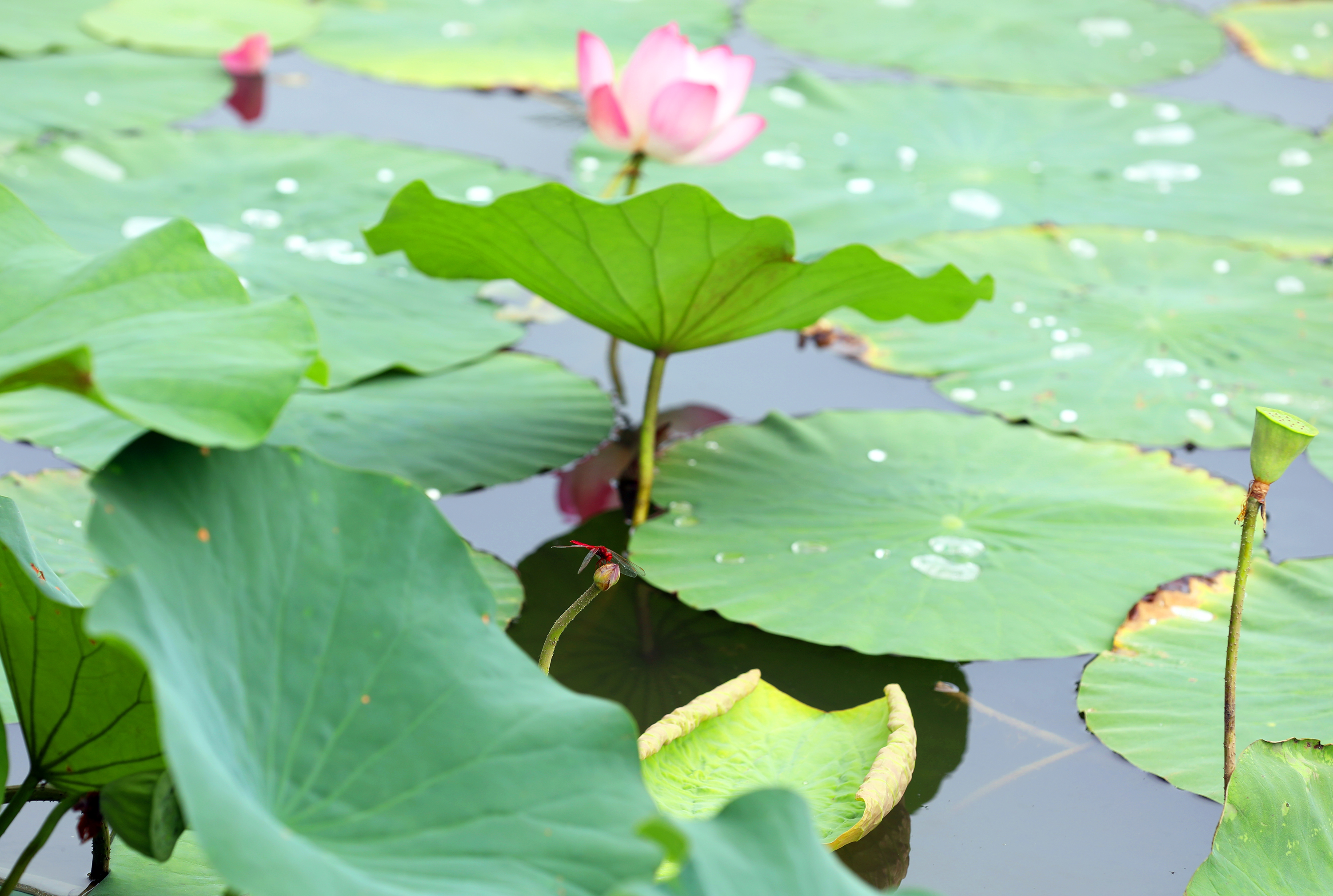 水下世界同样精彩。红、金、白相间的锦鲤在荷叶间穿梭嬉戏,当游客撒下鱼食,它们便迅速围拢,尾鳍搅动水面,连岸边的倒影也随之晃动。飘落水面的花瓣如同小船,引得鱼儿好奇触碰,趣味十足。