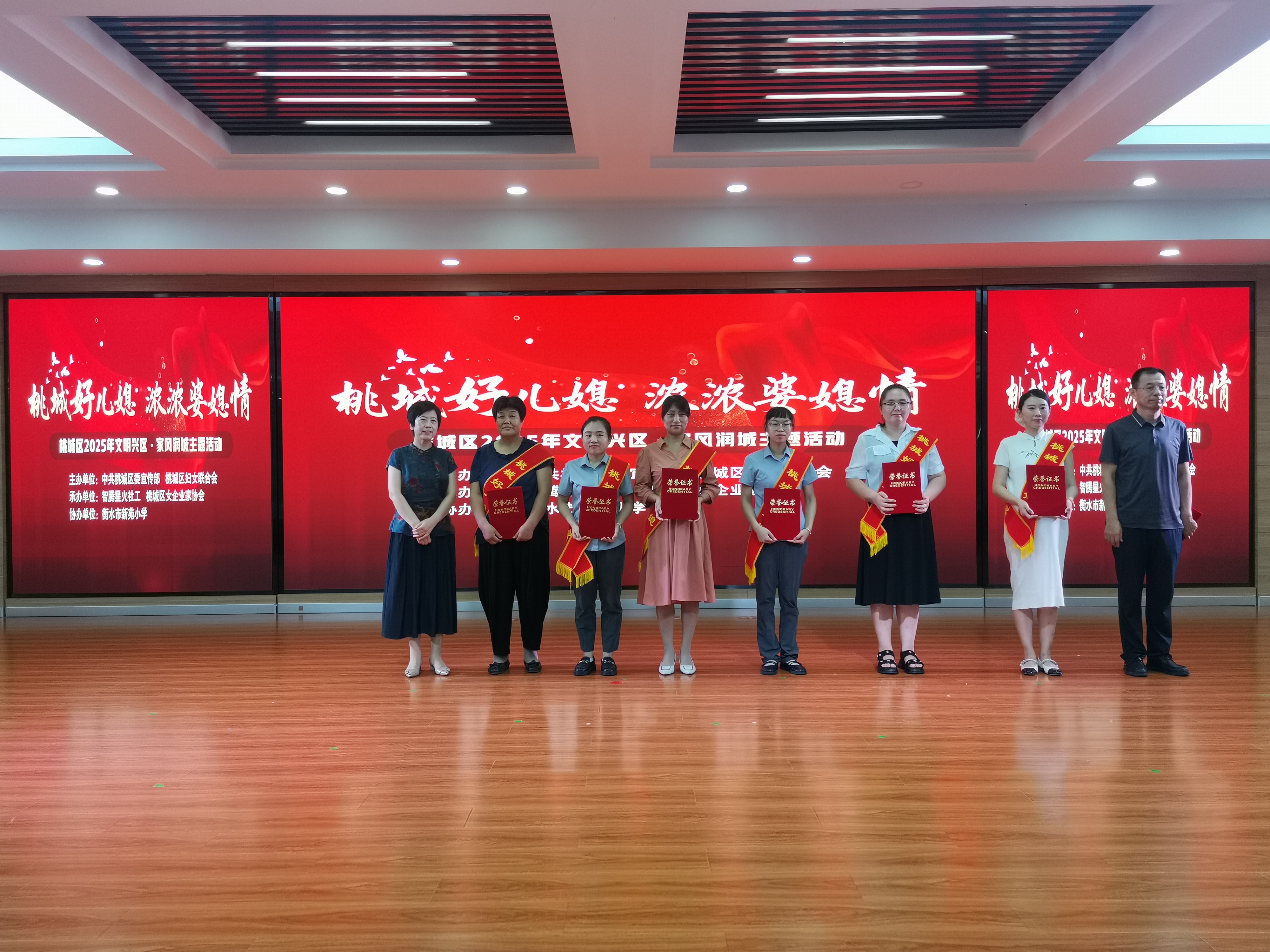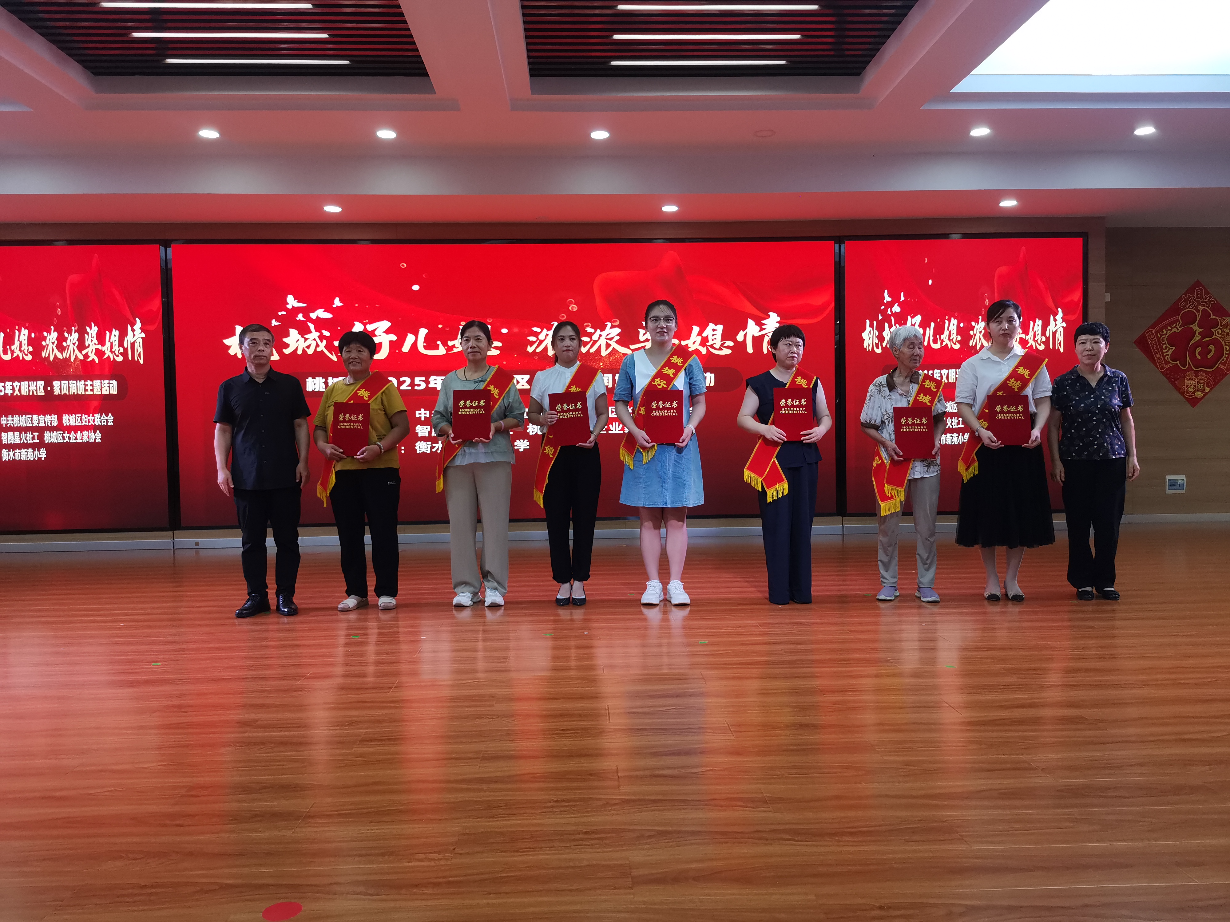 为充分发挥榜样示范引领和带动作用,活动现场为评选出来的“桃城好儿媳”进行表彰,为她们颁发了荣誉证书,并送上纪念品,以富有仪式感的形式,鼓励她们进一步弘扬传统美德、树立时代新风,起到先锋模范作用,营造和谐、健康、文明、向上的良好家风。