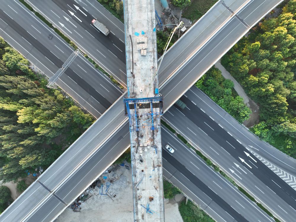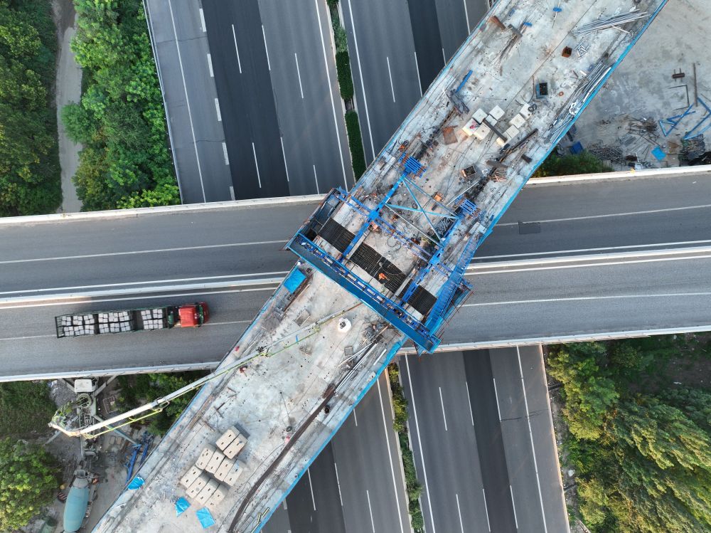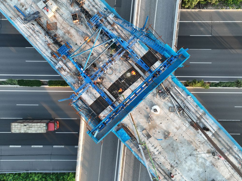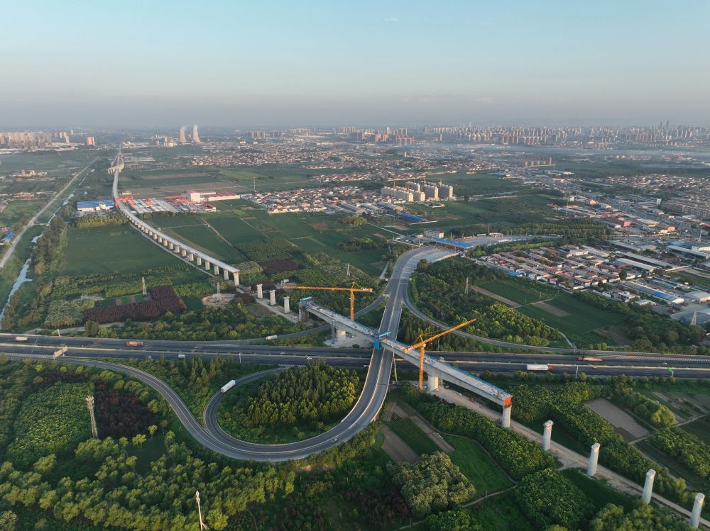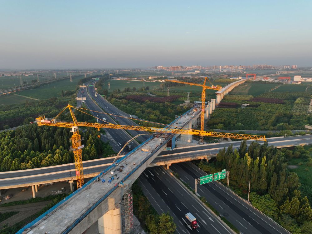 ↑ 7月18日拍摄的雄忻高铁保定东特大桥跨京港澳高速连续梁中跨施工现场(无人机照片)。