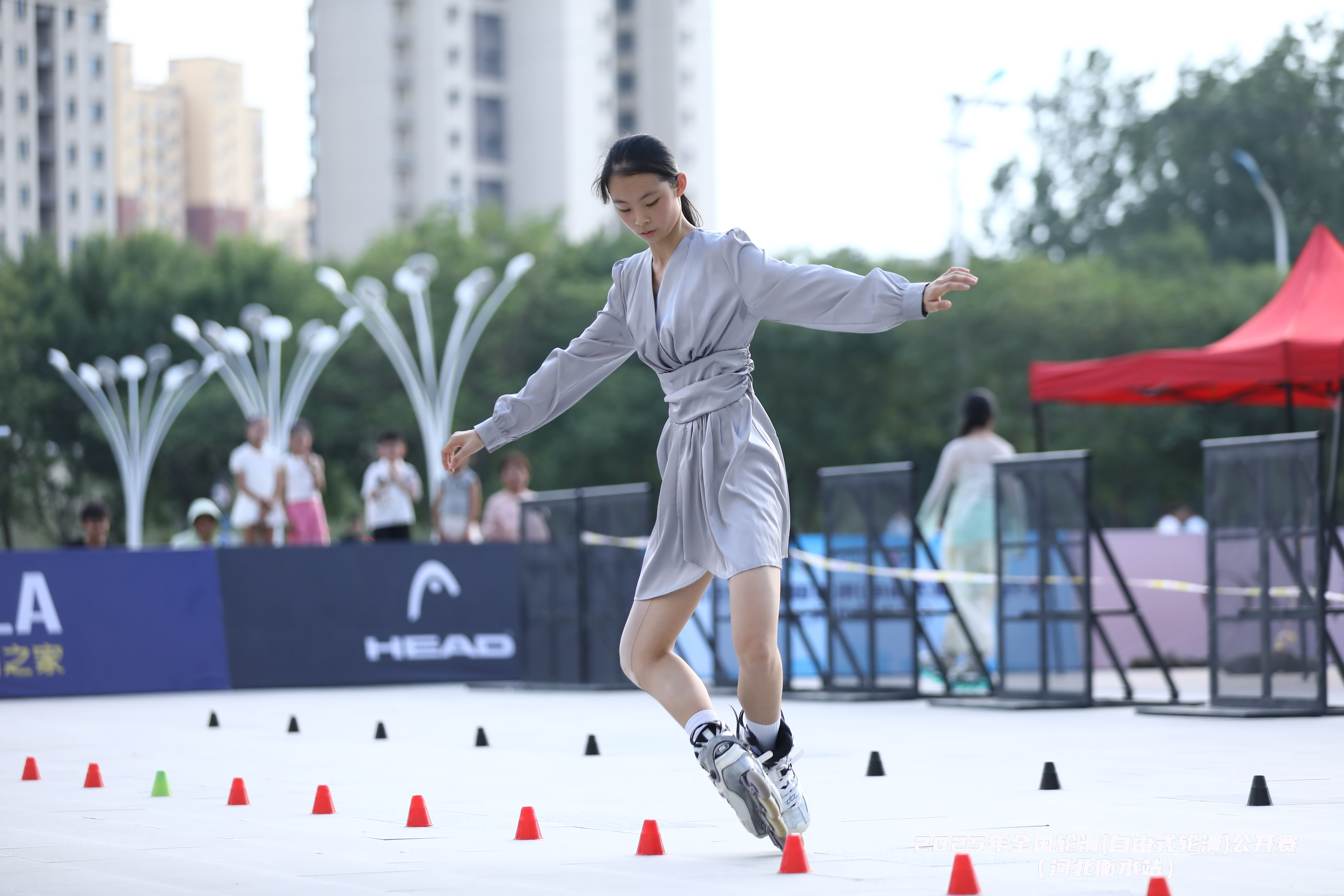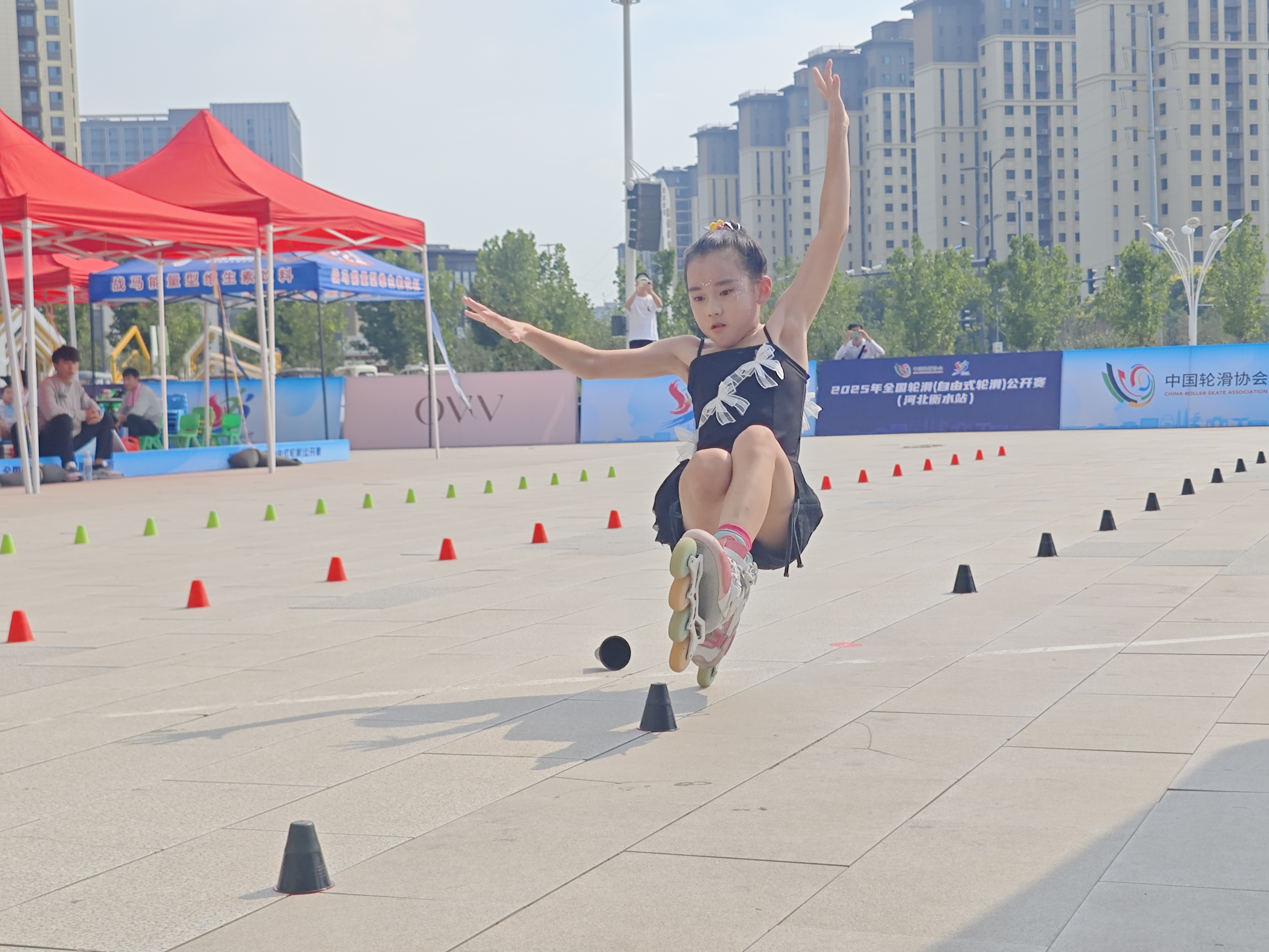 比赛中,花式绕桩环节的选手化身灵动舞者,脚下轮滑鞋如灵动画笔,在锥形桩间勾勒出流畅优美的轨迹,将自由式轮滑中艺术、难度和舞蹈相配合的特色表现得淋漓尽致;速度过桩项目里,选手们犹如离弦之箭,凭借精湛的控轮技巧与爆发力,在毫秒之间争夺胜利;花式刹停区域则惊险刺激,选手们以风驰电掣的速度急停,地面擦出绚丽火花,为观众带来了一场场精彩绝伦的视觉盛宴。