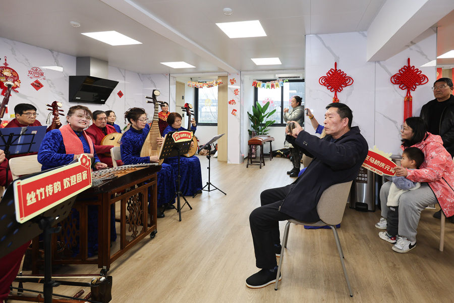 民乐队在上海市闵行区新时代城市建设者管理者之家演奏(2024年2月23日摄)。新华社记者 王翔 摄