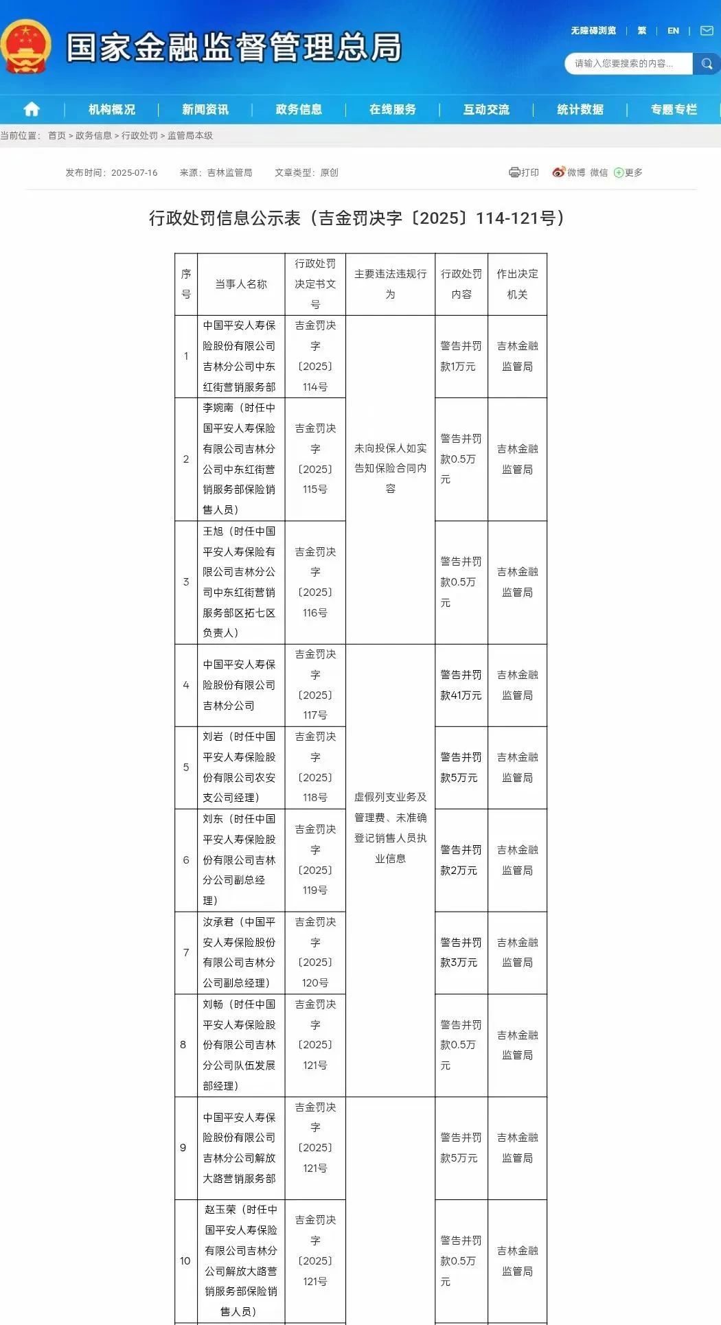 中国平安人寿保险股份有限公司吉林分公司因“虚假列支业务及管理费、未准确登记销售人员执业信息”,被吉林监管局“警告并罚款41万元”。同时,刘岩(时任中国平安人寿保险股份有限公司农安支公司经理)被警告并罚款5万元,刘东(时任中国平安人寿保险股份有限公司吉林分公司副总经理)被警告并罚款2万元,汝承君(中国平安人寿保险股份有限公司吉林分公司副总经理)被警告并罚款3万元,刘畅(时任中国平安人寿保险股份有限公司吉林分公司队伍发展部经理)被警告并罚款0.5万元。