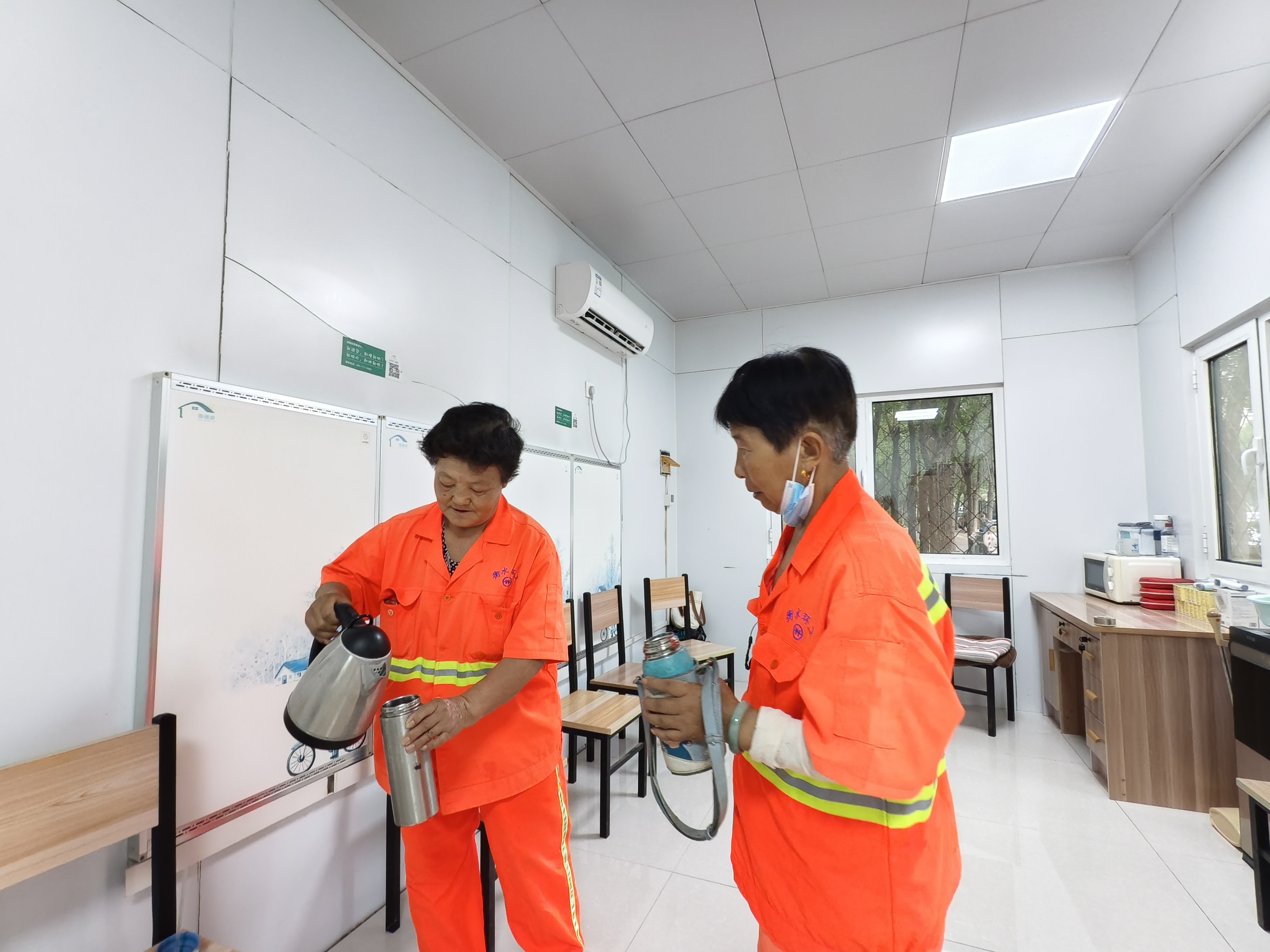环卫工人在环卫工人休息室饮水。杨雯 摄
