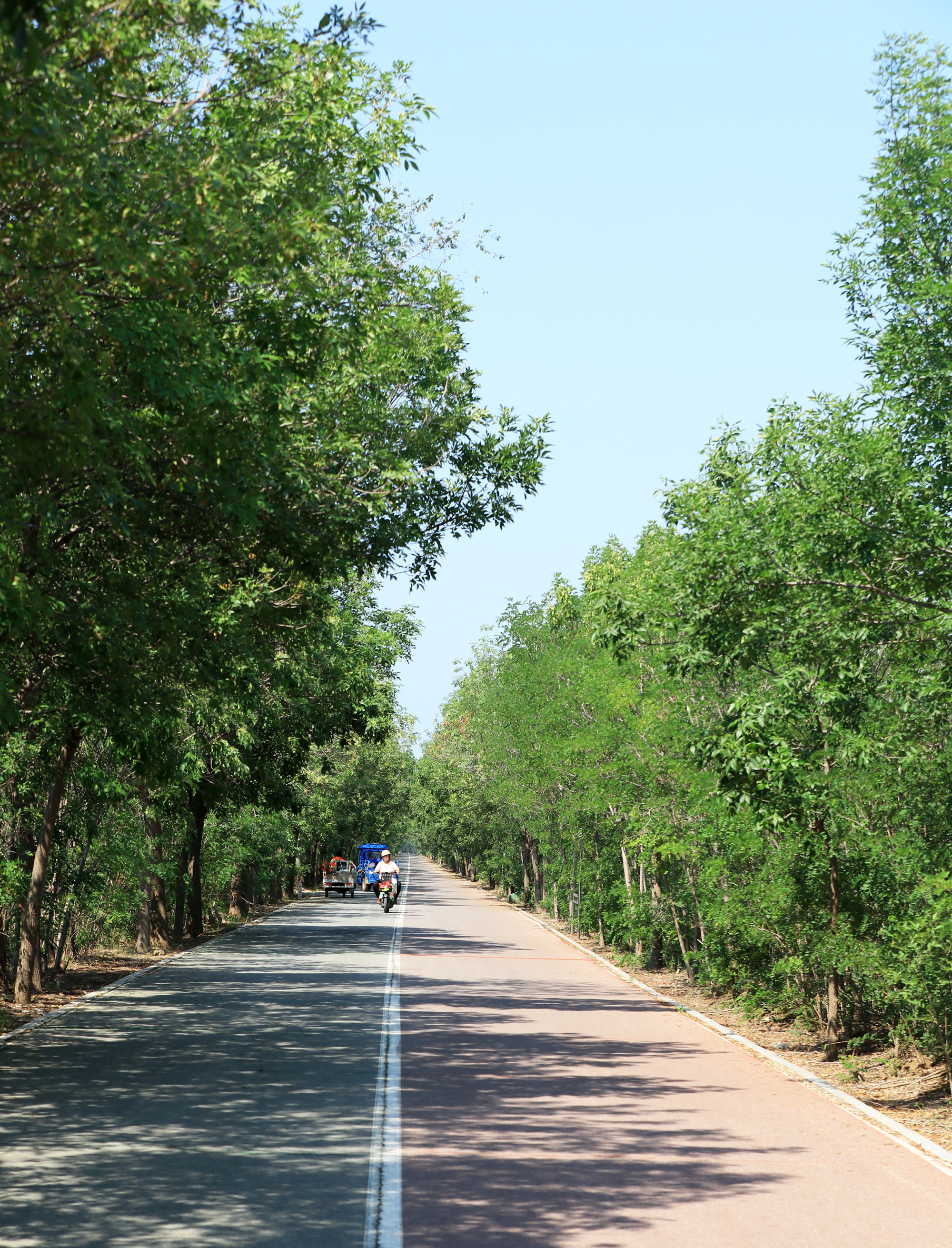 七公里的衡水湖健步路,藏在浓荫深处。道旁乔木舒展枝叶,灌木缀满新绿,阳光穿过层层叠叠的叶隙,在路面洒下斑驳的光点。风过时,树叶沙沙作响,裹挟着草木与湖水的清润气息,漫过整条长径。