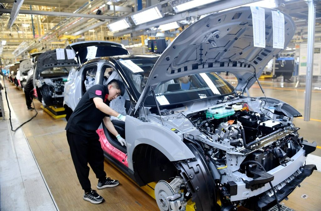 6月19日,工作人员在张家口南山汽车产业基地一家车企的总装车间组装汽车。 新华社记者王晓摄