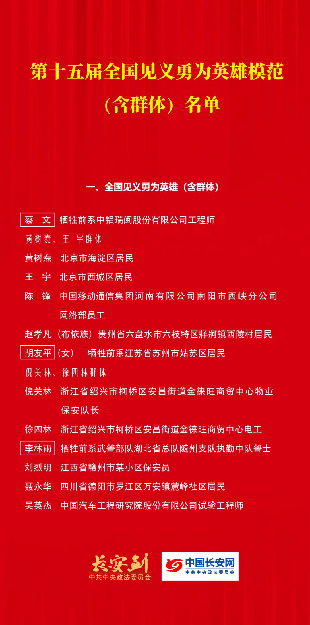 第十五届全国见义勇为英雄模范表彰大会7月21日在京召开,8名个人和2个群体获“全国见义勇为英雄”称号,40名个人和10个群体获“全国见义勇为模范”称号。