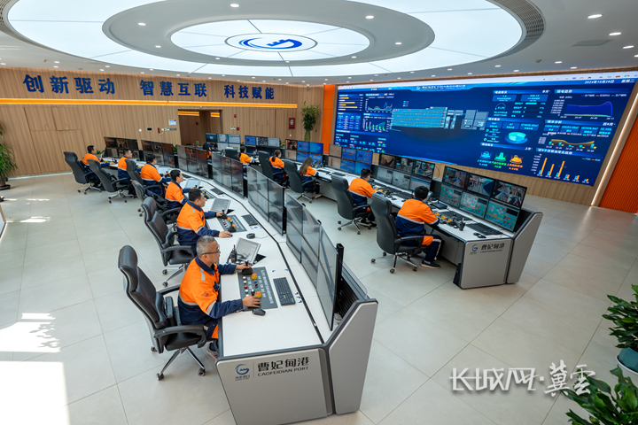 在河北港口集团曹港矿石码头调度集控中心,工作人员远程控制机械作业。