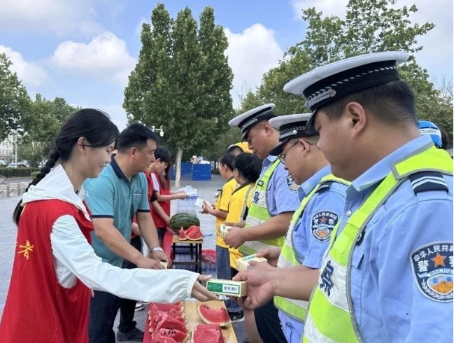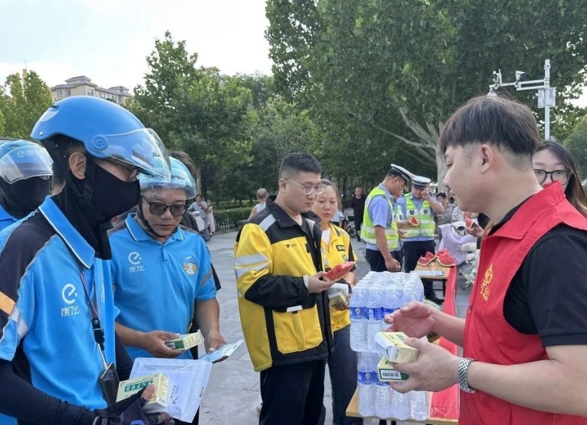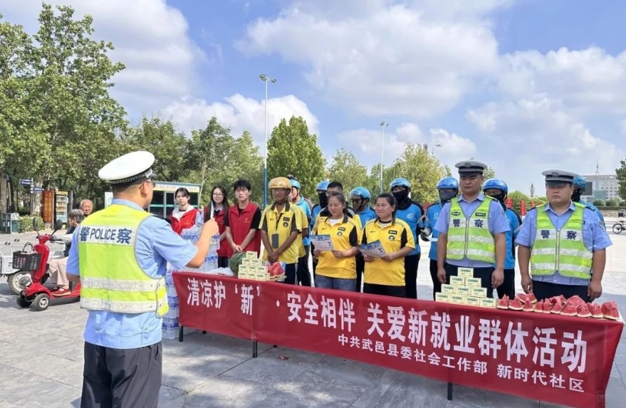 7月22日上午,武邑县新时代社区开展“清凉护‘新’·安全相伴”关爱新就业群体活动,为在炎炎夏日中坚守岗位的外卖员、快递小哥等户外劳动者送去安全知识与清凉关怀。