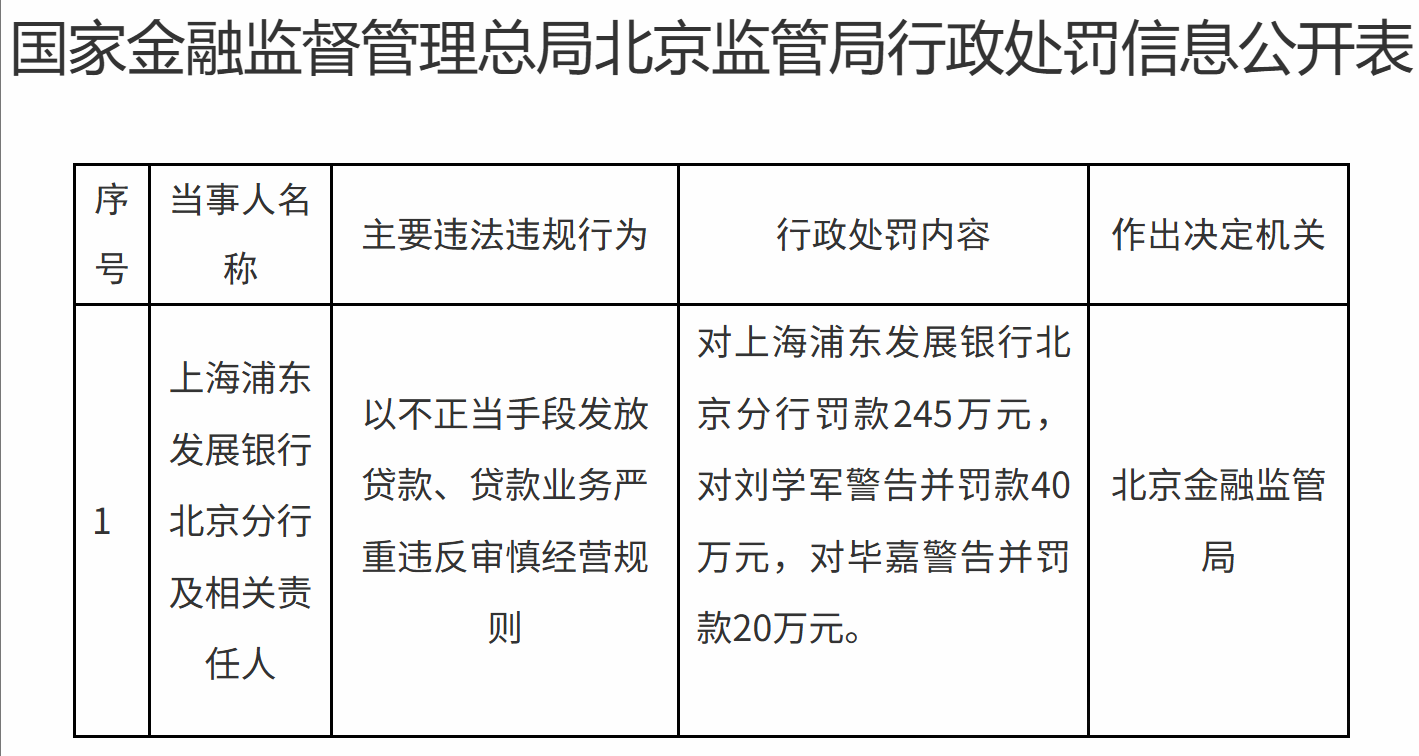7月18日,国家金融监督管理总局北京监管局行政处罚信息公开表显示,上海浦东发展银行(下简称“浦发银行”)北京分行以不正当手段发放贷款、贷款业务严重违反审慎经营规则,被罚款245万元,同时对刘学军警告并罚款40万元,对毕嘉警告并罚款20万元。