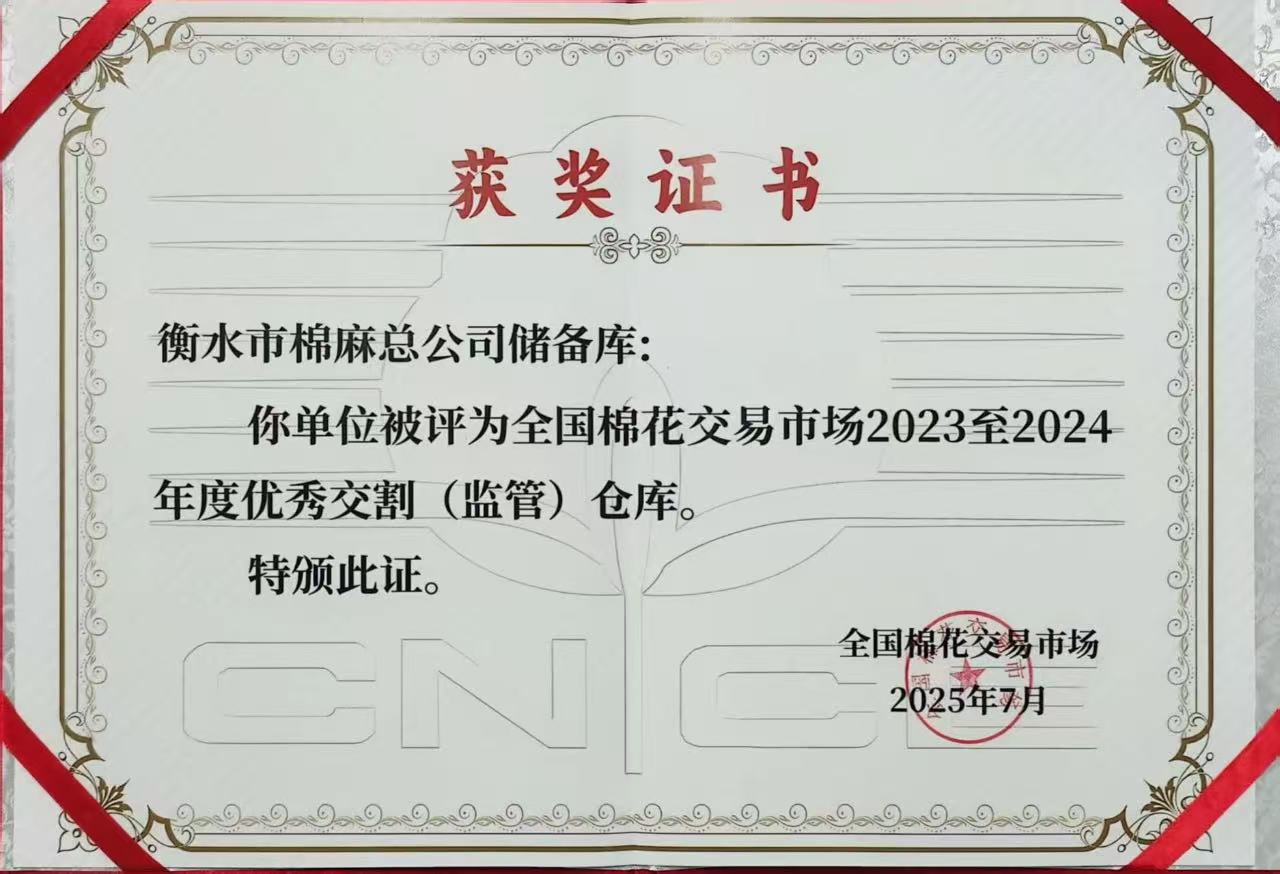 日前,全国棉花交易市场2025年度仓储工作会议在深圳召开,衡水市供销社社属棉麻总公司储备库获评全国棉花交易市场优秀交割(监管)仓库,全国共有21家骨干企业仓储获此荣誉。