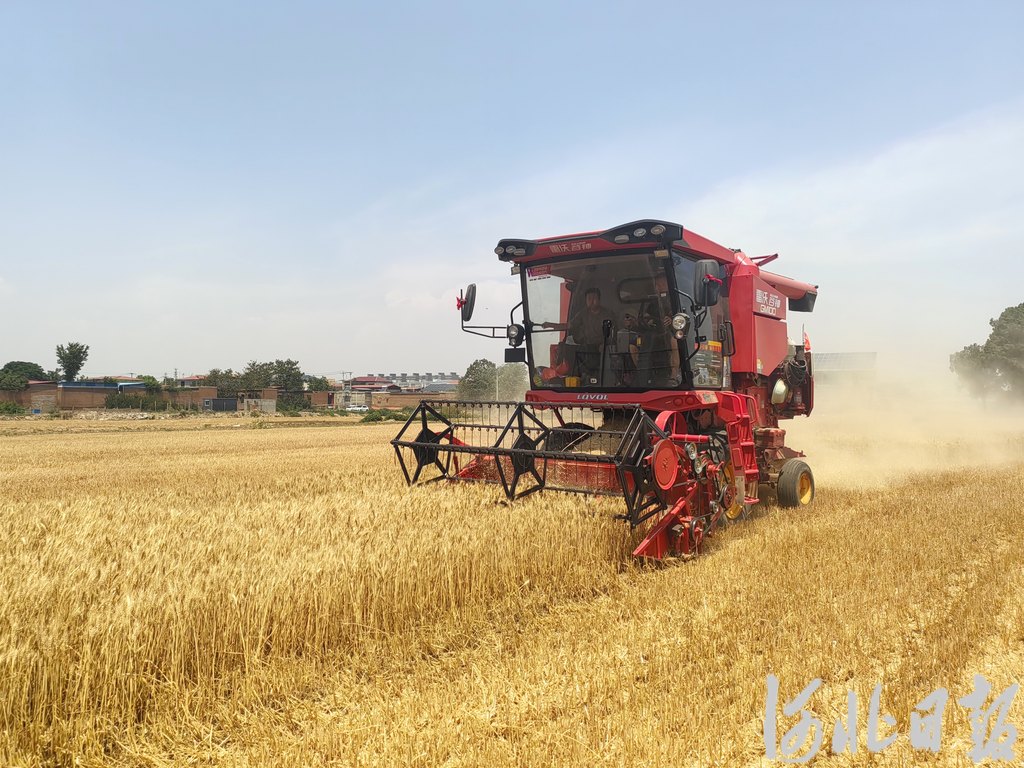 6月9日,在邯郸市永年区刘营镇陈刘营村的麦田里,收割机正收获小麦。河北日报记者郝东伟摄