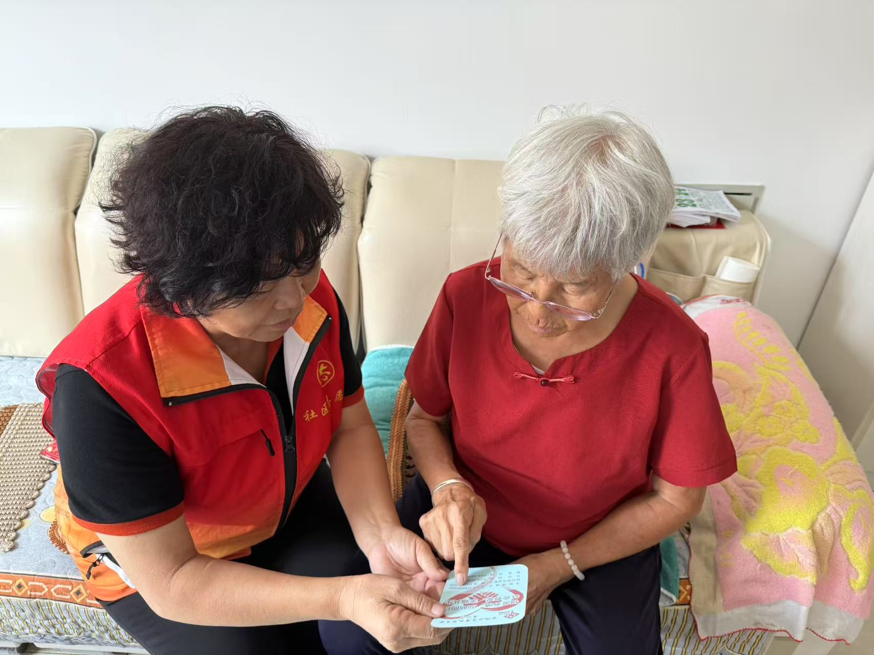 “年纪大了,腿脚不方便,需要什么,打个电话就有志愿者上门!”85岁的张进花老人展示手中的“连心卡”,卡片上清晰印着结对志愿者和网格员的联系方式。