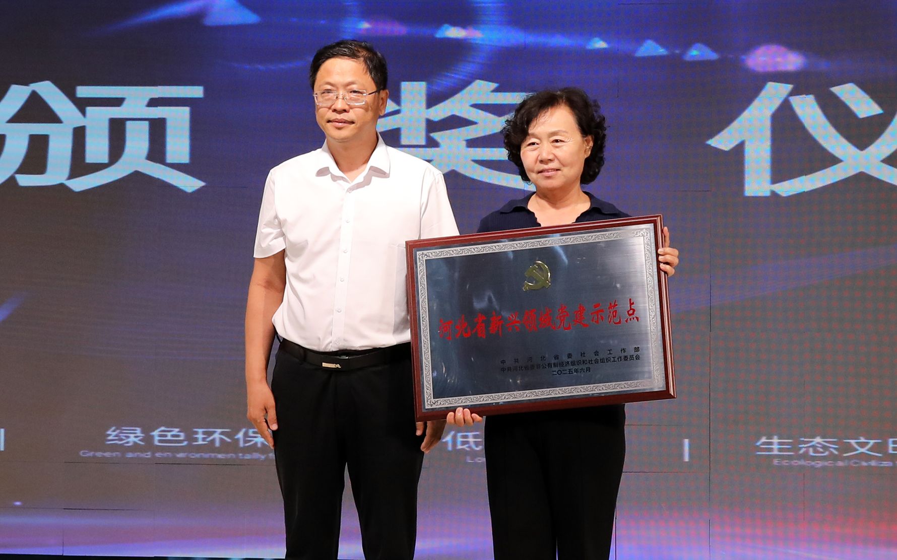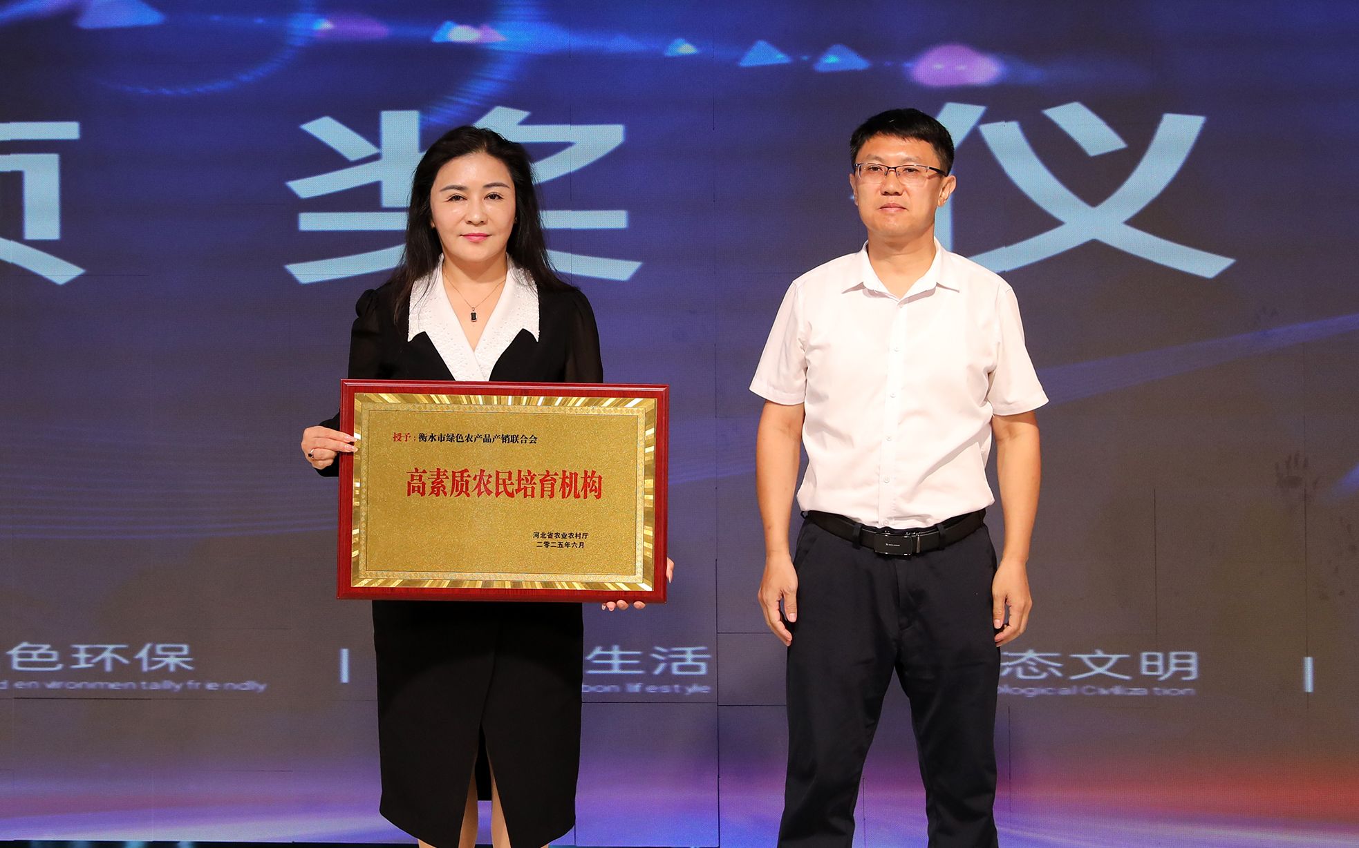 同时,在会议举行过程中,衡水市非公经济商(协)会党委领导为衡水市绿色产业联合会联合党支部授予《河北省新兴领域党建示范点》牌匾,衡水市农业农村局领导向衡水市绿色农产品产销联合会颁发《高素质农民培育机构》牌匾。