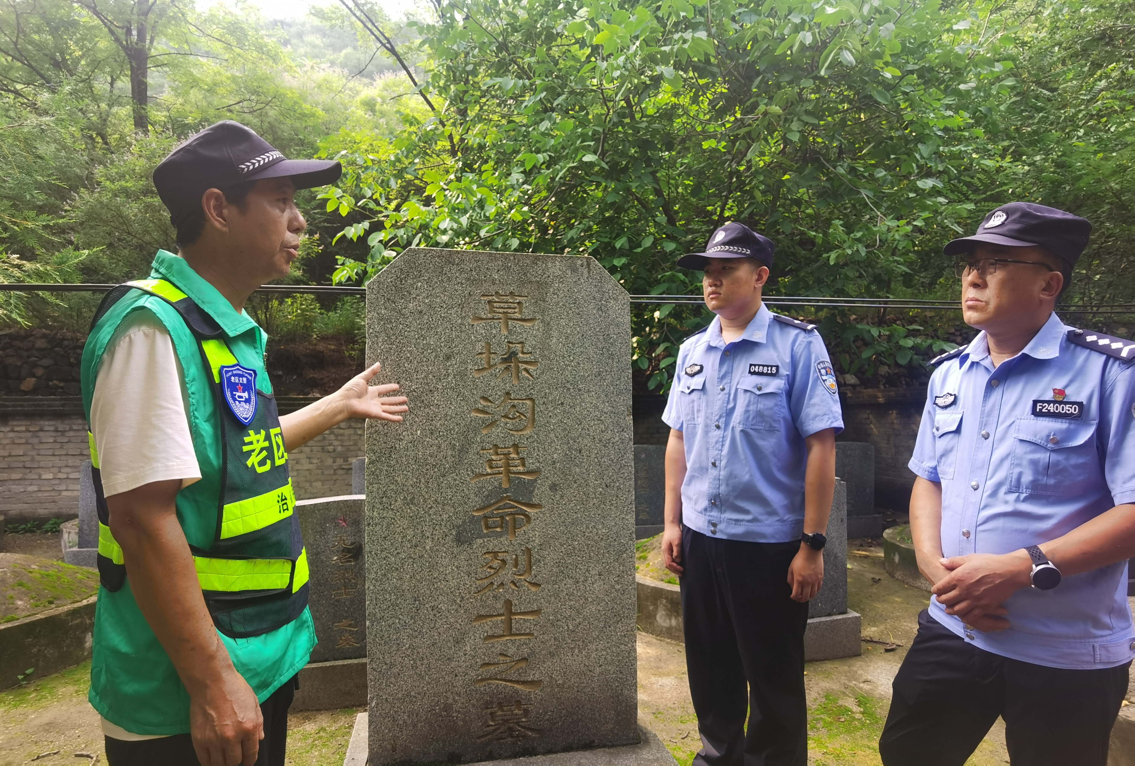 图为民辅警和义警在草垛沟烈士陵园重温抗战故事。