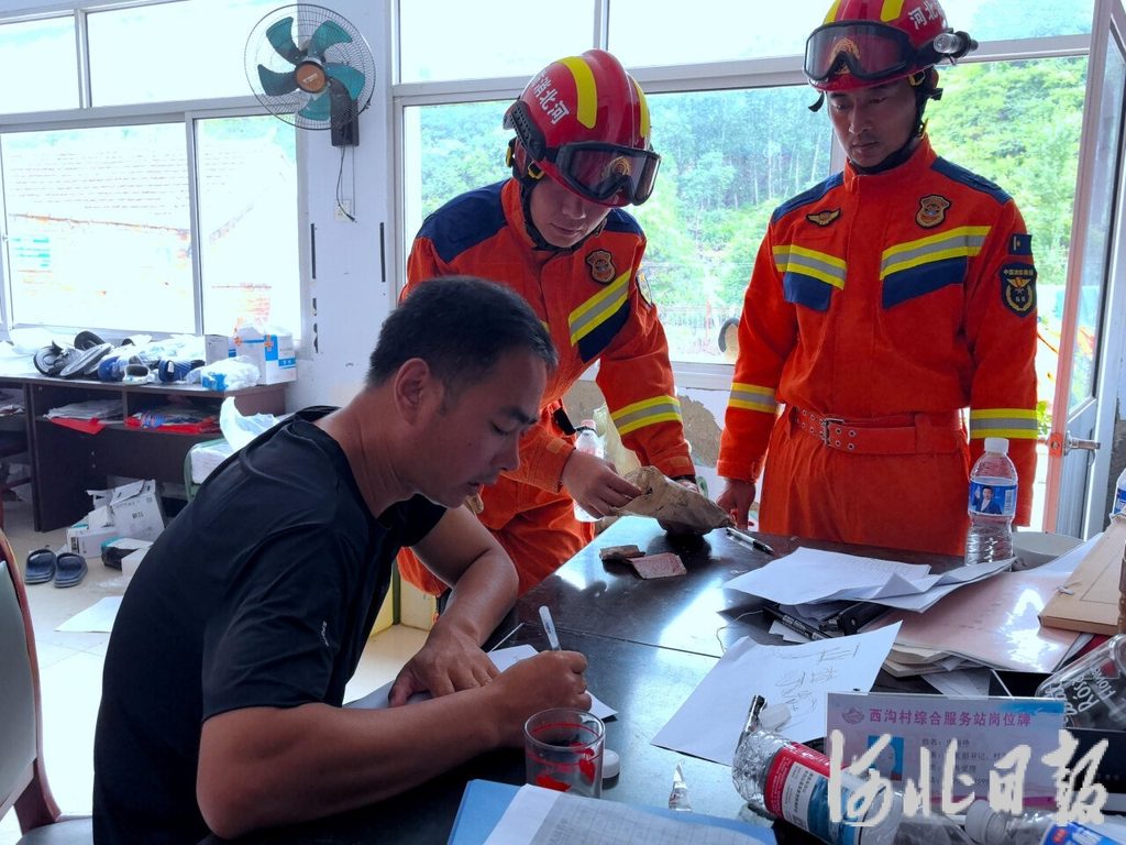 村委会外,留守小组成员、滦平县应急管理局局长李亚军正和消防救援人员商议下午的重点搜救区域。