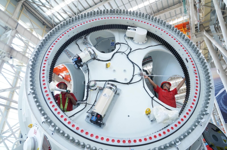 图为工人正在检测金风科技秦皇岛总装基地下线的机舱叶轮 王继军 摄