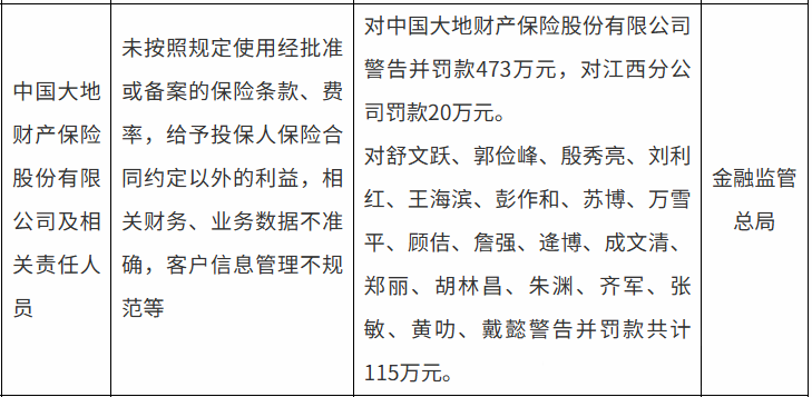 8月1日,国家金融监督管理总局行政处罚信息公示列表显示,中国大地财产保险股份有限公司(下简称“大地财险”)因未按照规定使用经批准或备案的保险条款、费率,给予投保人保险合同约定以外的利益,相关财务、业务数据不准确,客户信息管理不规范等,被金融监管总局警告并罚款473万元,对江西分公司罚款20万元。