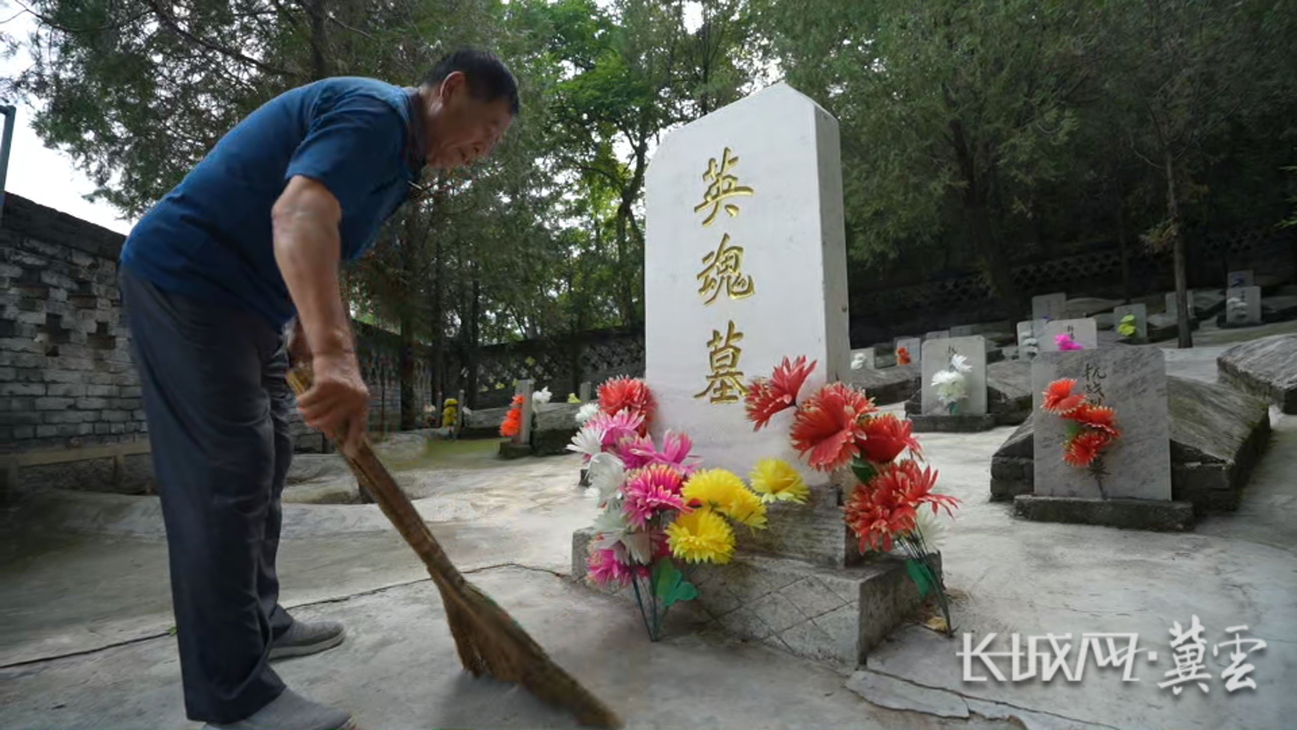 阜平县夏庄乡菜池村党支部书记兼村委会主任李文军在擦拭墓碑。长城网·冀云客户端记者 马宁 摄