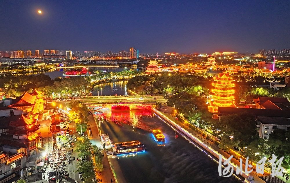 日前,夜幕降临,京杭大运河沧州市中心城区段流光溢彩、游船穿梭。多元文旅消费场景给沧州市民和游客带来全新体验。河北日报见习记者张昊摄
