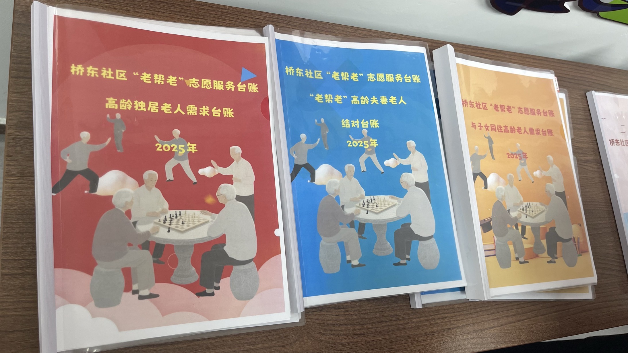 “红色本是高龄独居老人需求台账,蓝色本是高龄夫妻老人结对台账,黄色本是与子女同住高龄老人需求台账。”桥东社区党委书记、居委会主任张秀成介绍说,这些不同颜色的台账将高龄老人的需求进行分类,银发志愿者据此提供不同的帮老服务。