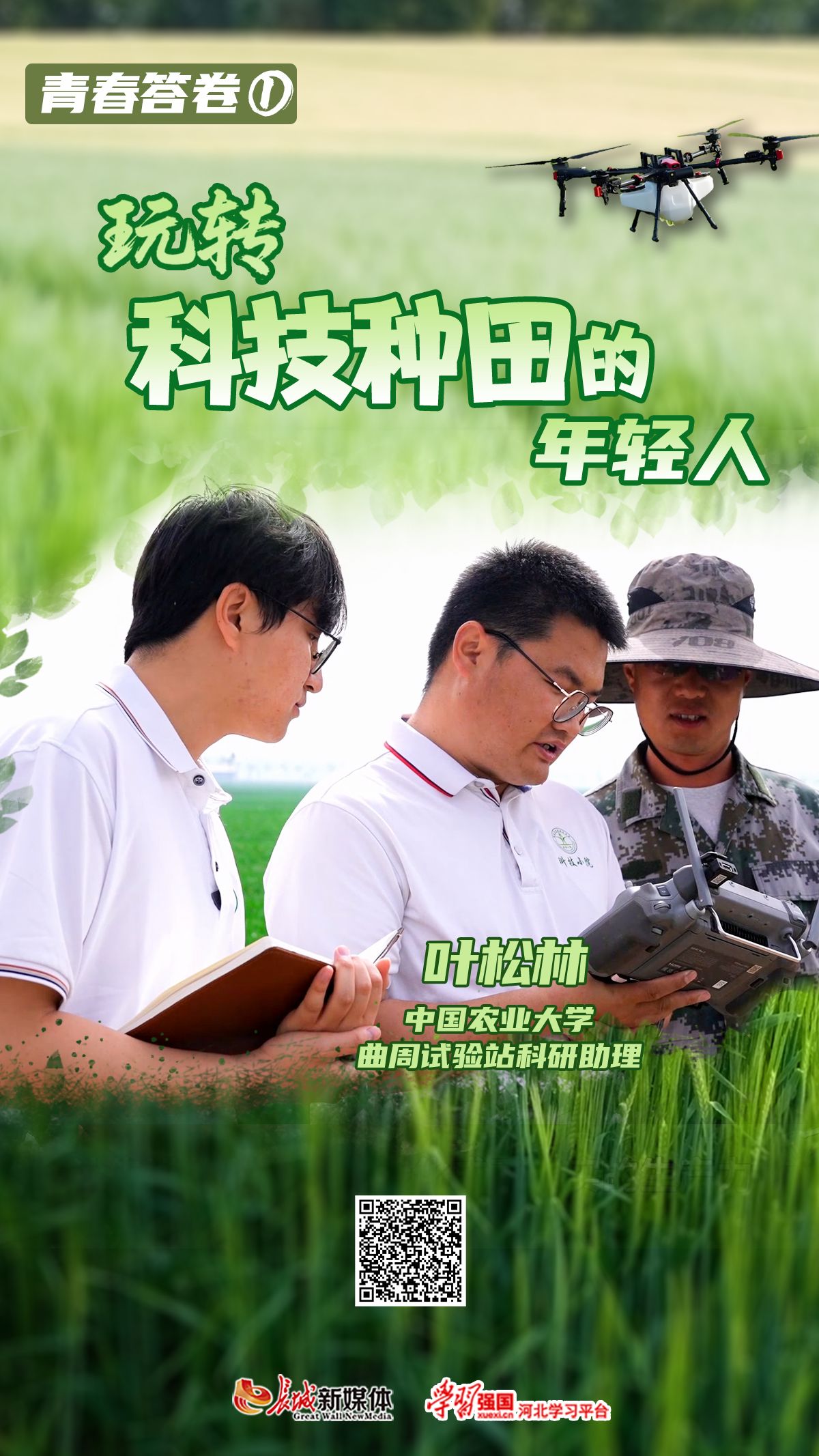 即日起,长城新媒体集团联合“学习强国”学习平台,推出系列微纪录片《青春答卷》,记录新时代青年如何在强国征程上刻下闪耀的青春印记。第1集《玩转“科技种田”的年轻人》,讲述中国农业大学曲周实验站科研助理叶松林和他的伙伴们的故事。