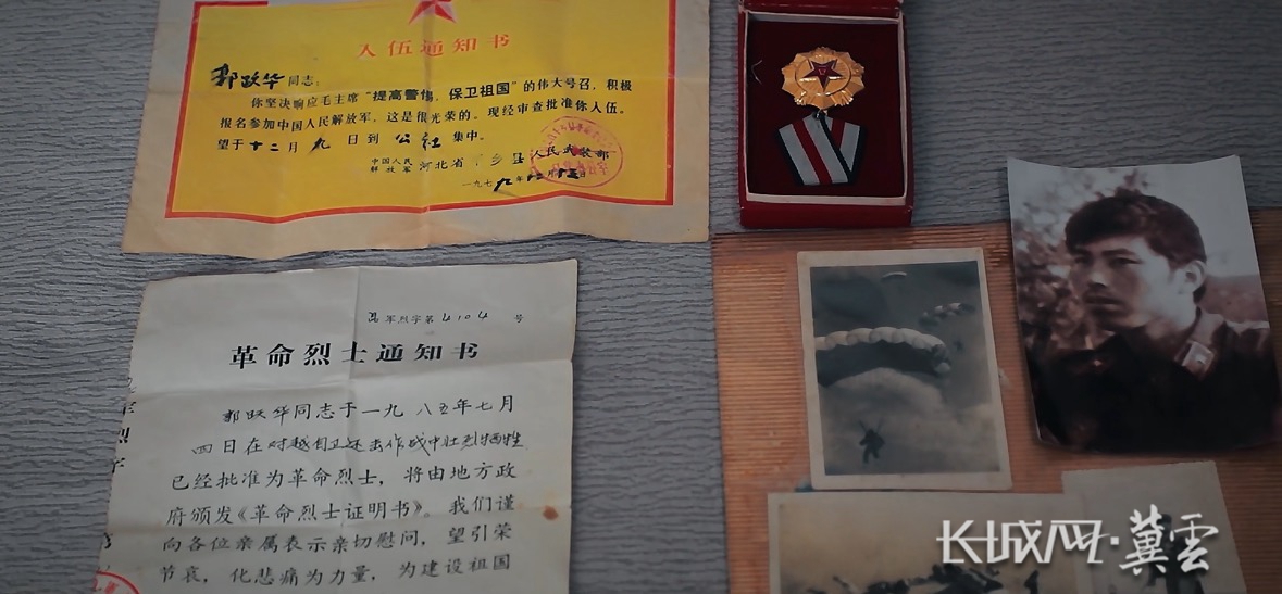 郭跃华的老照片、入伍通知书、烈士通知书和一等功奖章。长城网·冀云客户端记者 武新杰 摄