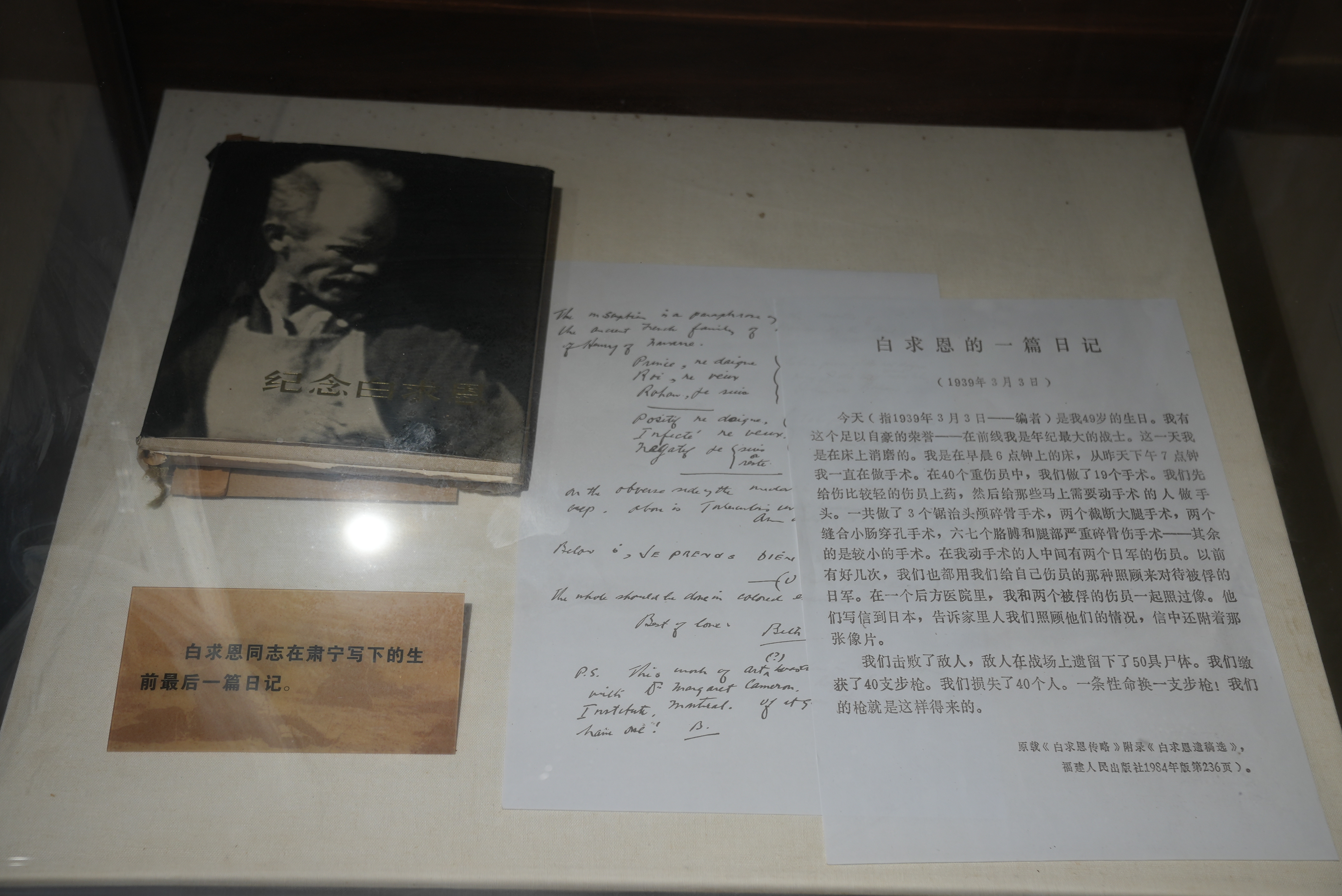 八路军第120师挺进冀中抗战指挥部旧址的展室内,陈列着白求恩写下的最后一篇日记。