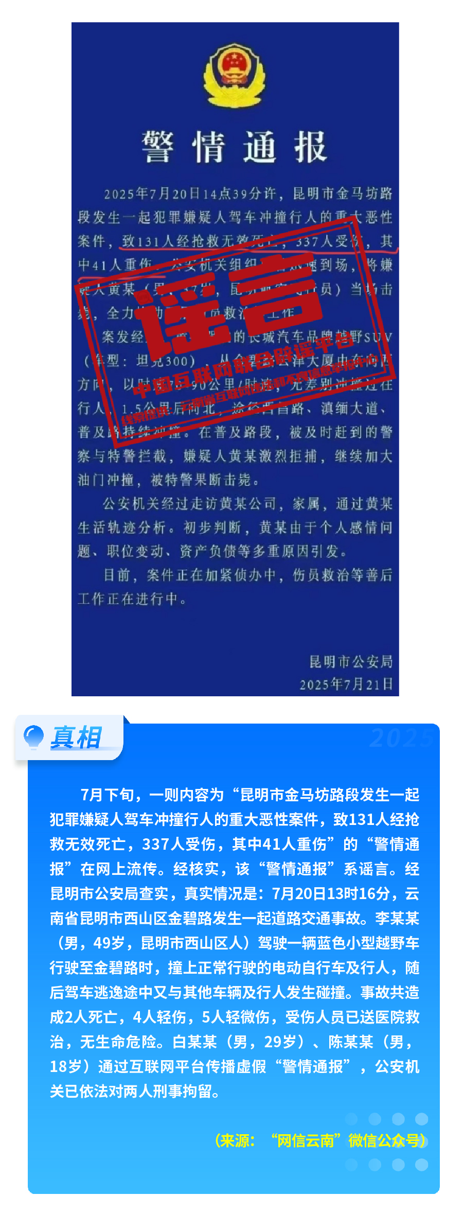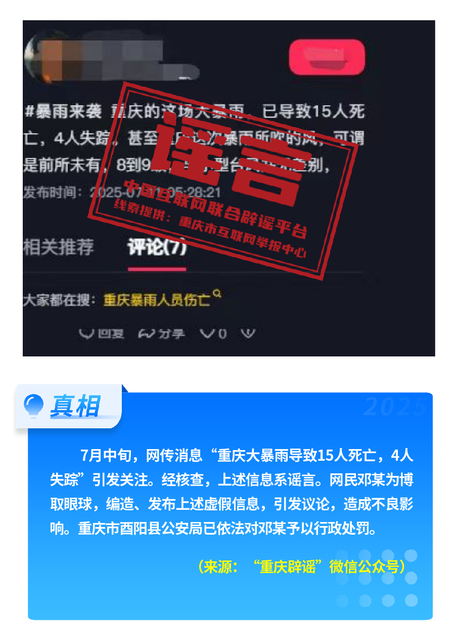 近期,网上接连出现发布虚假“警情通报”的恶性造谣传谣案件,炮制传播“昆明驾车撞人案131人死亡”“杭州自来水接入粪水”及涉释永信虚假“警情通报”,模仿“蓝底白字”格式,杜撰耸人听闻细节,损害政府公信力,严重扰乱社会秩序。“院士预测广东将发生8级以上大地震”公然伪造专家聊天截图,谎报地震预警。还有造谣者借盛夏高温酷暑与洪涝灾害,编造“安徽淮北、山东泰安等地多人因高温死亡” “重庆大暴雨导致15人死亡、4人失踪”等谣言,蹭炒热点、煽动情绪。