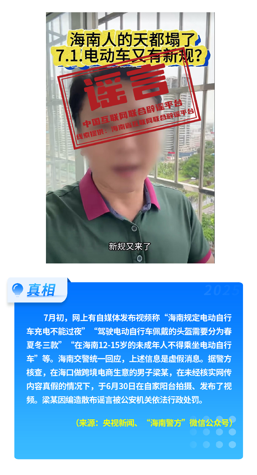 有人重新翻炒“医保‘个人账户’将全部取消”旧谣,故意歪曲医保改革真实内涵,严重误导公众对医保改革政策的理解。“有专人上门服务激活医保码”,披着“公共服务”的外衣,实有诈骗之嫌和安全风险。凭空捏造“海南规定电动自行车充电不能过夜、头盔分三季”这一“奇葩规定”,以“新规”话术,扰乱交通管理秩序。