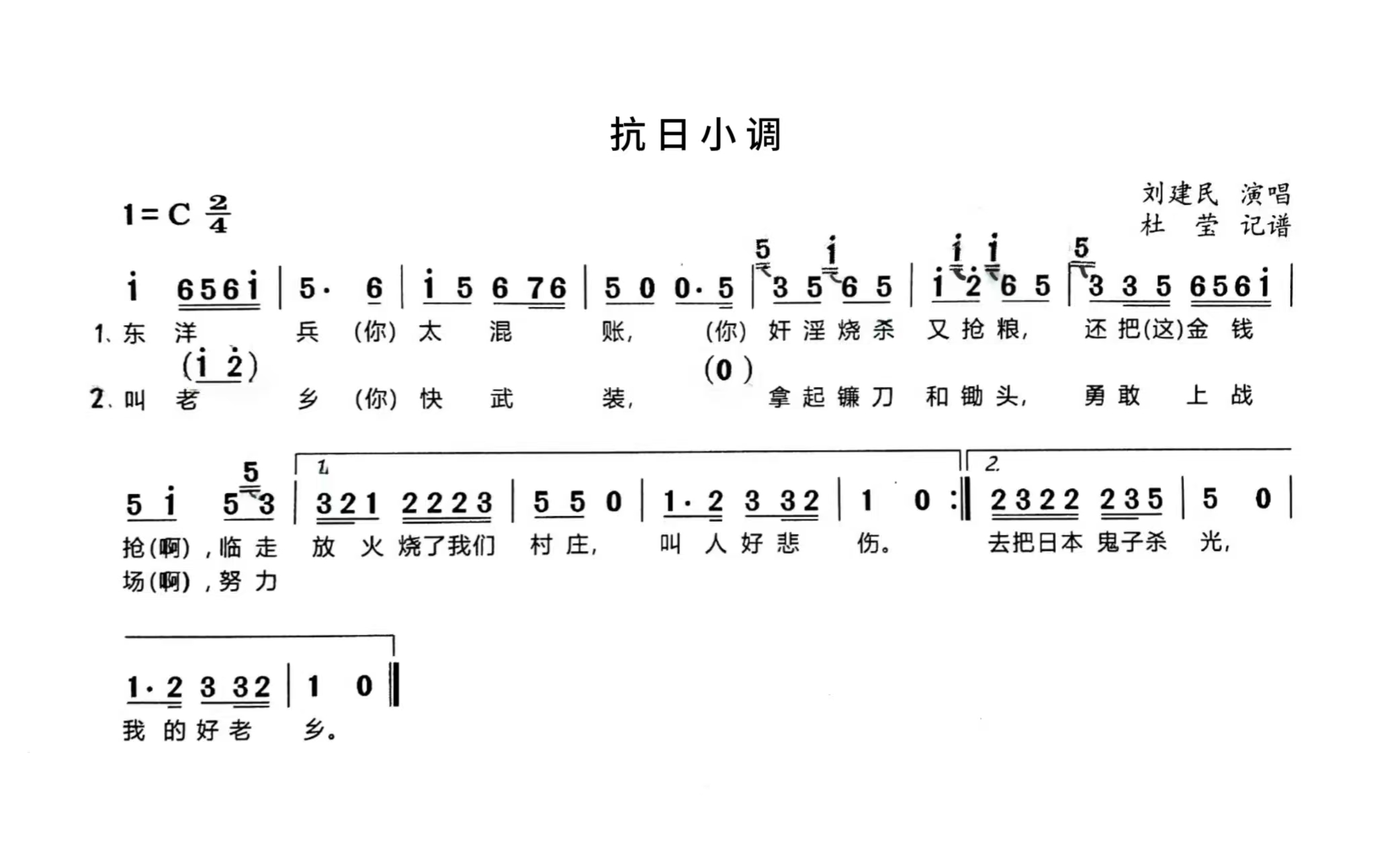 2002年的八一建军节,在辽宁省军区原沈阳第一干休所任管理员的杜宝权在座谈会上见证了动人一幕:86岁高龄的副师职离休干部刘建民,即兴唱起尘封的小调。“每一个字都带着劲儿,像在战场上喊话。”杜宝权对小调记忆很是深刻,“老人唱的完整版歌词是:东洋兵(你)太混账,(你)奸淫烧杀又抢粮,还把(这)金钱抢(啊),临走放火烧了我们村庄,叫人好悲伤。叫老乡(你)快武装,拿起镰刀和锄头,勇敢上战场(啊),努力去把日本鬼子杀光,我的好老乡。”
