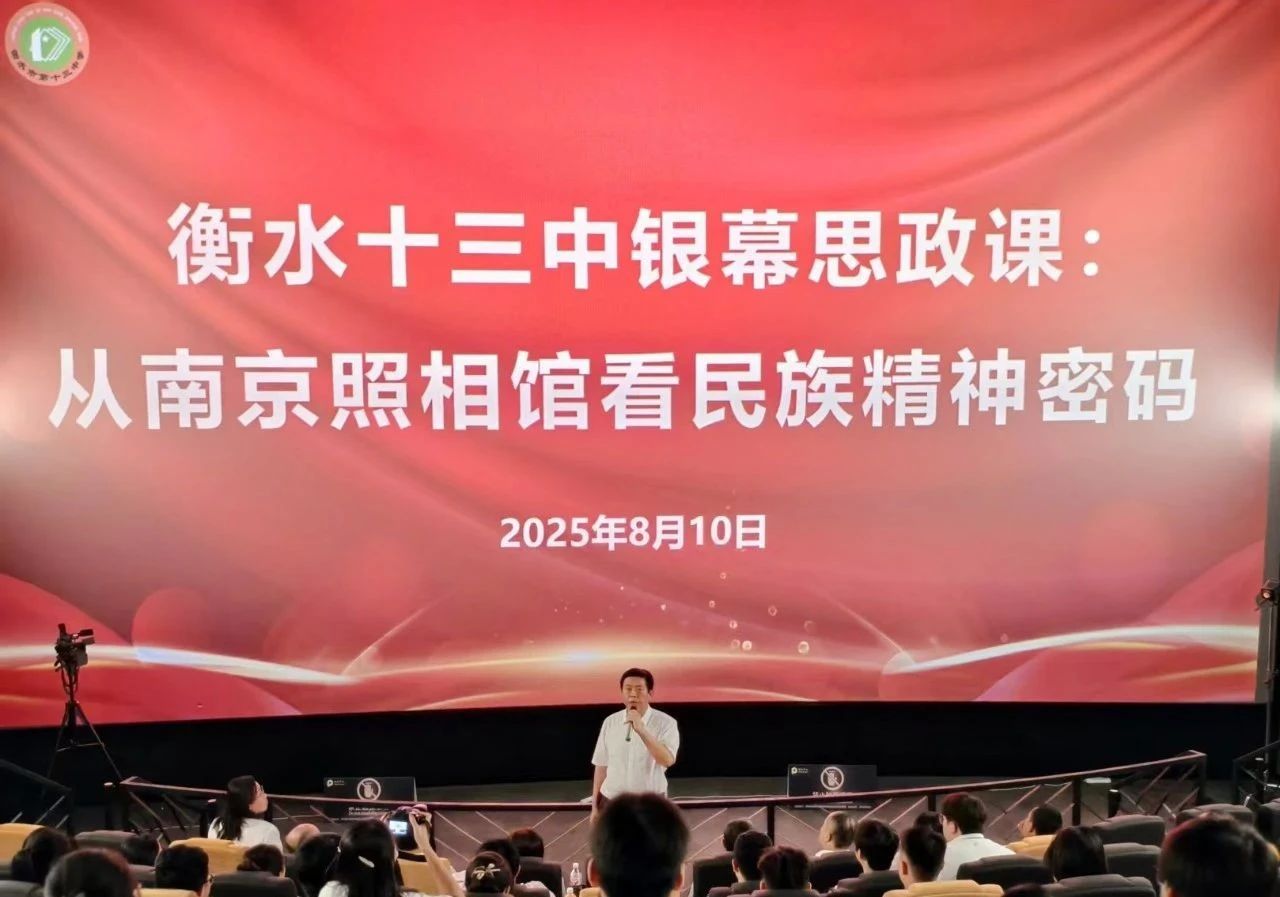 为厚植家国情怀,坚定理想信念,近日,衡水市第十三中学精心组织了一场特别的“银屏里的思政课”。学校领导班子成员、教师与学生代表等130余人,集体走进影院,观看了重大历史题材电影《南京照相馆》。观影结束后,全体人员齐聚一堂,举行了一场庄严而富有教育意义的主题思政教育活动,让思想在光影中升华,让信念在仪式中凝聚。