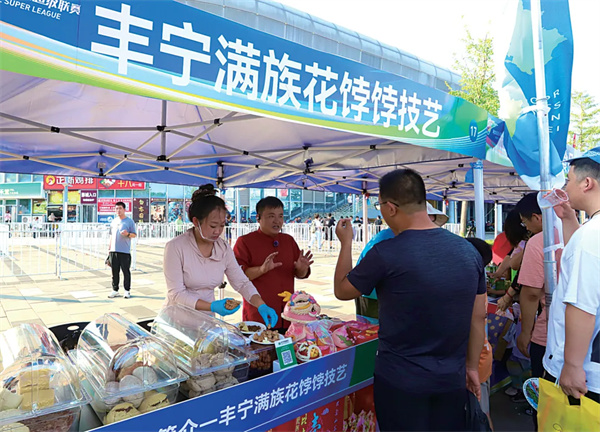 体育场外,体育市集人气爆火,丰宁采摘式烤全羊推介,丰宁满族剪纸、布糊画等非遗技艺展示、农产品展销等摊位依次排开,吸引了众多市民和游客的目光。承德山水、承德好礼、比亚迪汽车等品牌现场开展促销活动,现场球迷、观众一起品美食、看表演、享优惠。