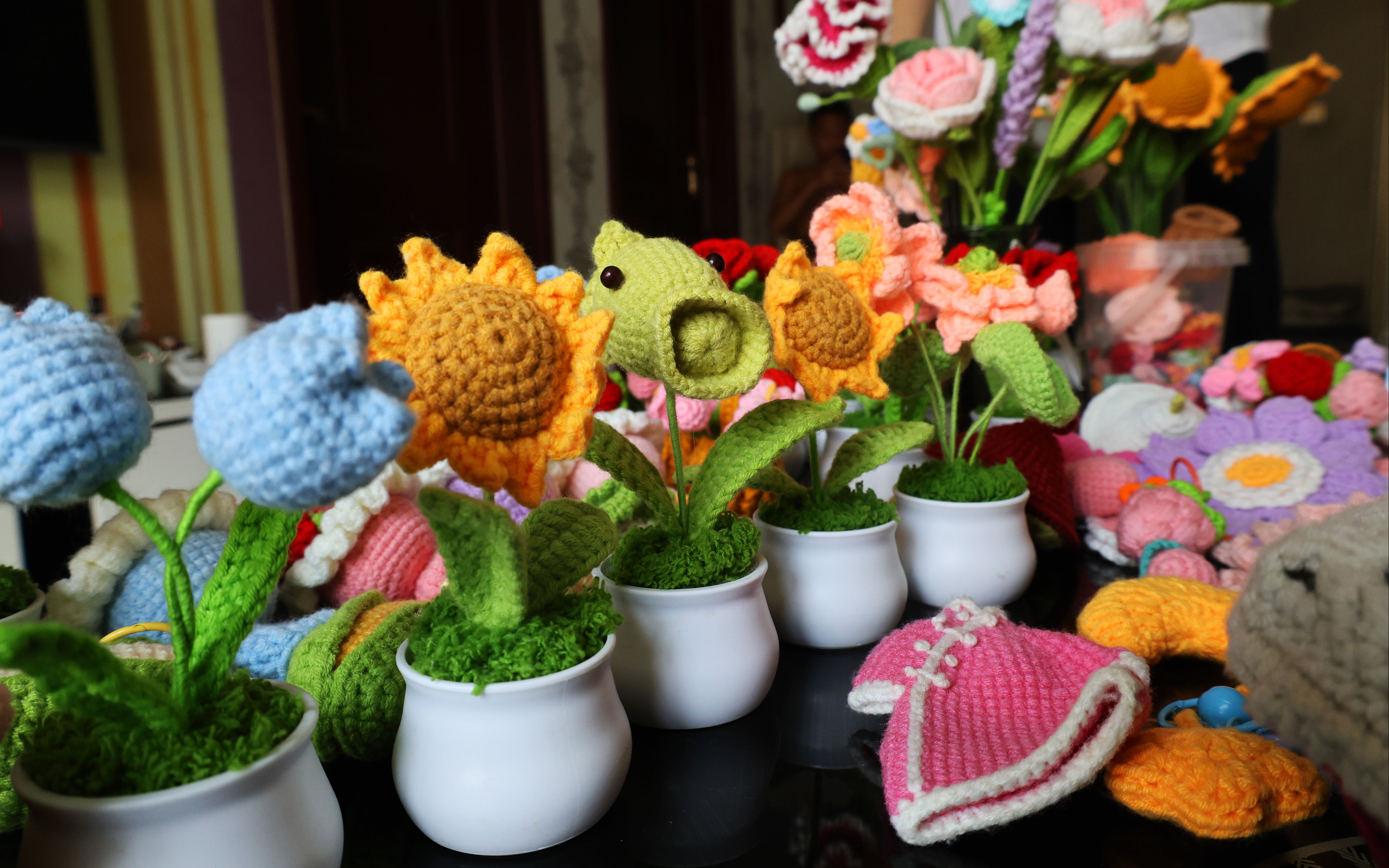 真正让钩编从“家常活计”变成“心头热爱”,是在36岁那年。吕艳梅结婚后一直忙于照顾孩子,等孩子稍大些,她终于有了些空余时间,重新拾起了钩针。一次在手机上刷到钩编玫瑰花的视频,她心底的火苗被瞬间点燃。“从没钩过这种工艺品,跟着教程学,第一次钩出来的玫瑰,歪歪扭扭的,跟视频里差远了。”她不服气,拆了重钩,不知不觉就到了深夜12点,“勾不出想要的样子,根本睡不着。”就这么拆了钩、钩了拆,半天功夫才终于掌握诀窍。