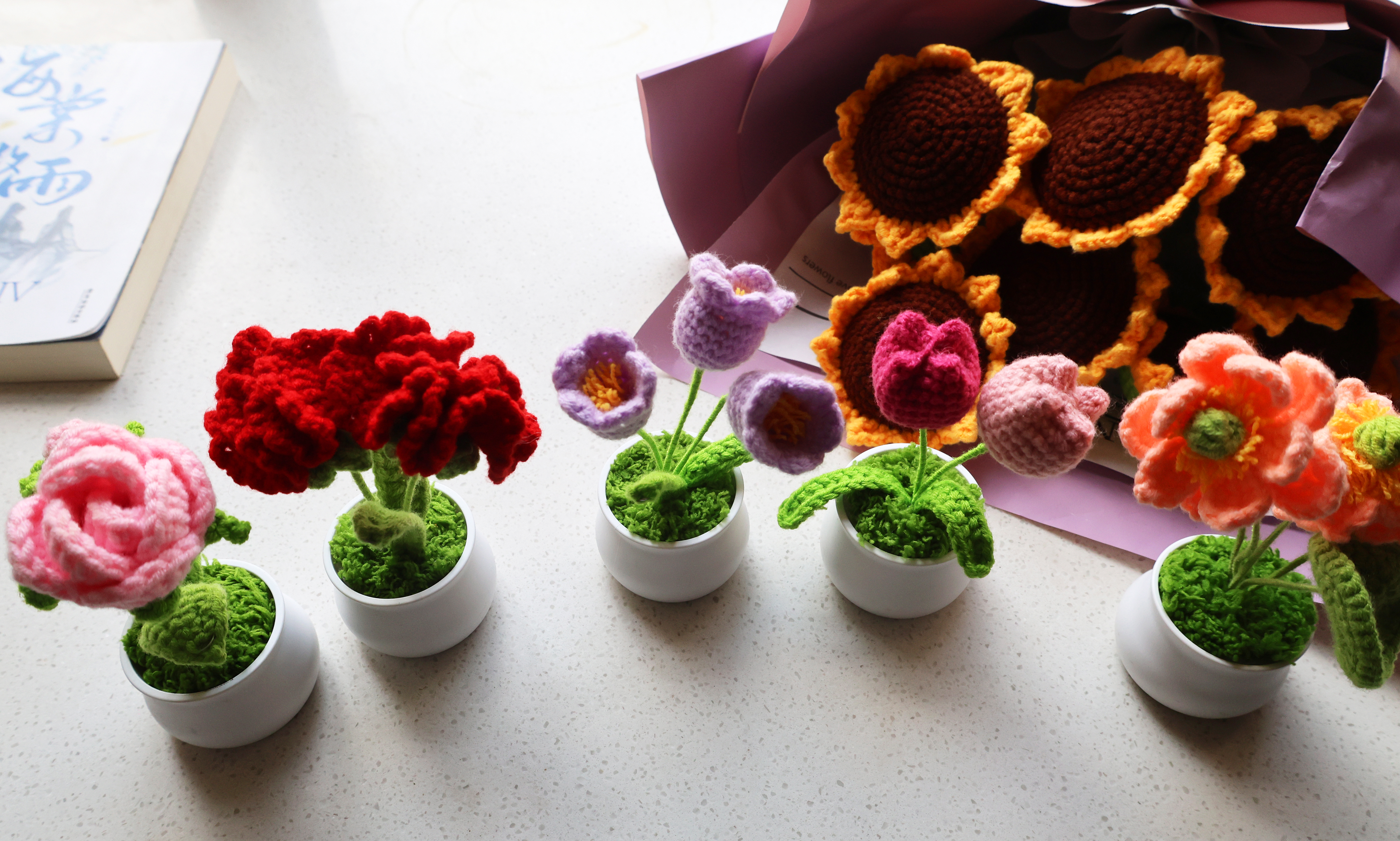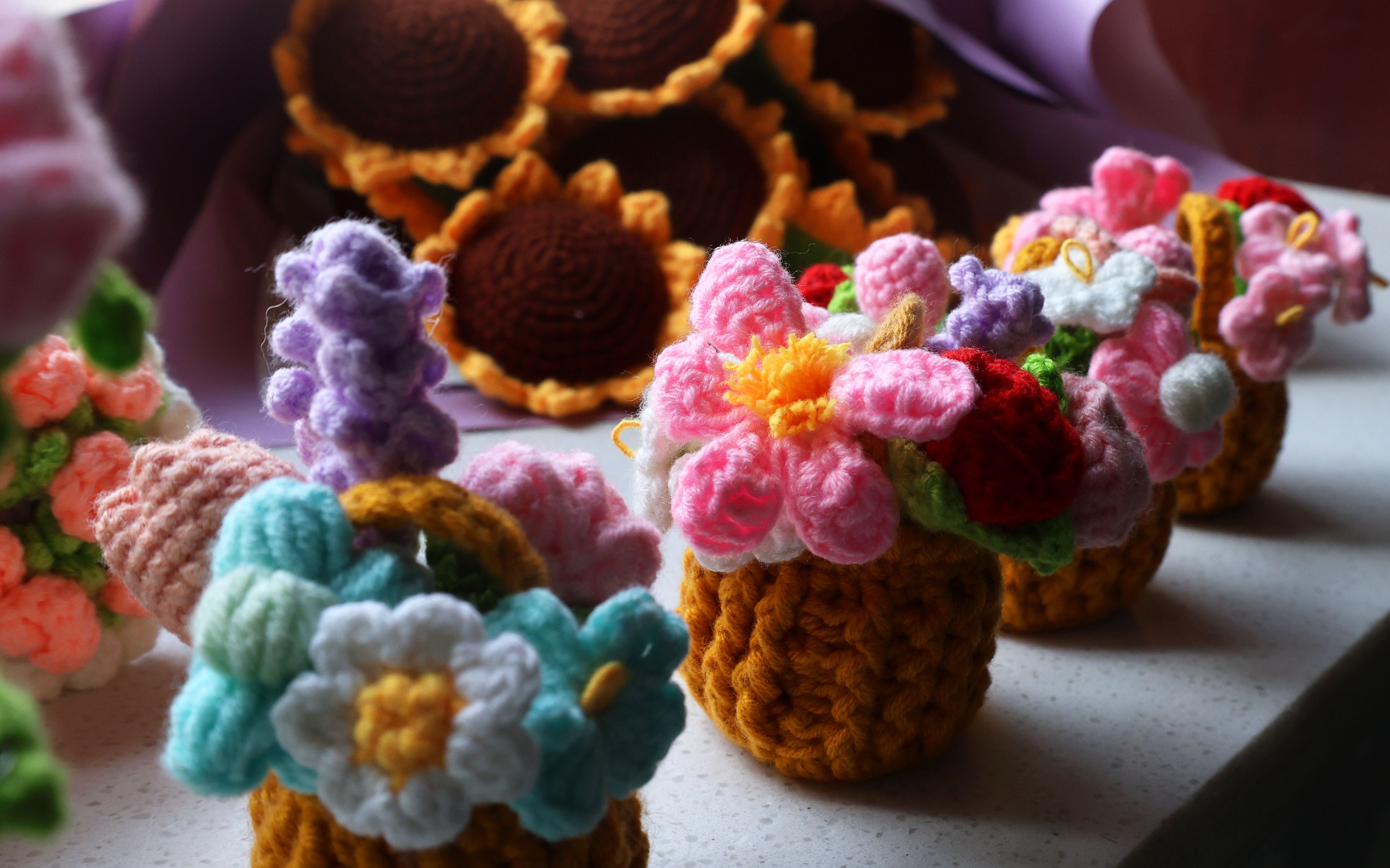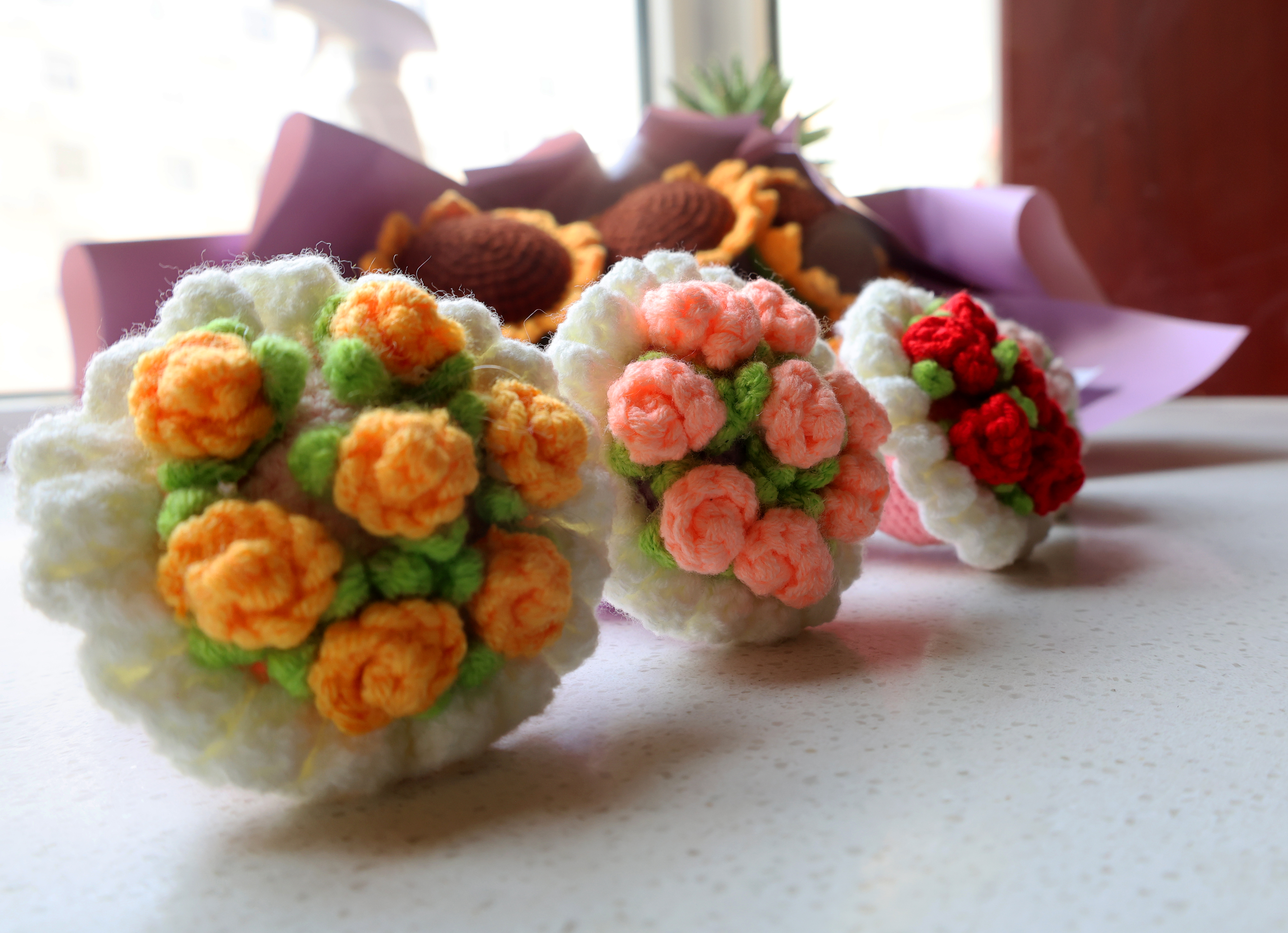 从此,吕艳梅像着了魔:粉色玫瑰娇艳,橘色玫瑰热烈,渐变色玫瑰层次分明,她一口气钩织了能想到的所有颜色;后来又挑战百合、向日葵、薰衣草,每朵花都得琢磨半天——长针勾勒花瓣的舒展,短针收紧花芯的饱满,加针、减针调整弧度,毛线的粗细还要搭配不同型号的钩针,“差一丝,花就没了灵气。”钩好的花送给亲友,总被夸“手巧”,这份认可,成了她继续创作的动力。