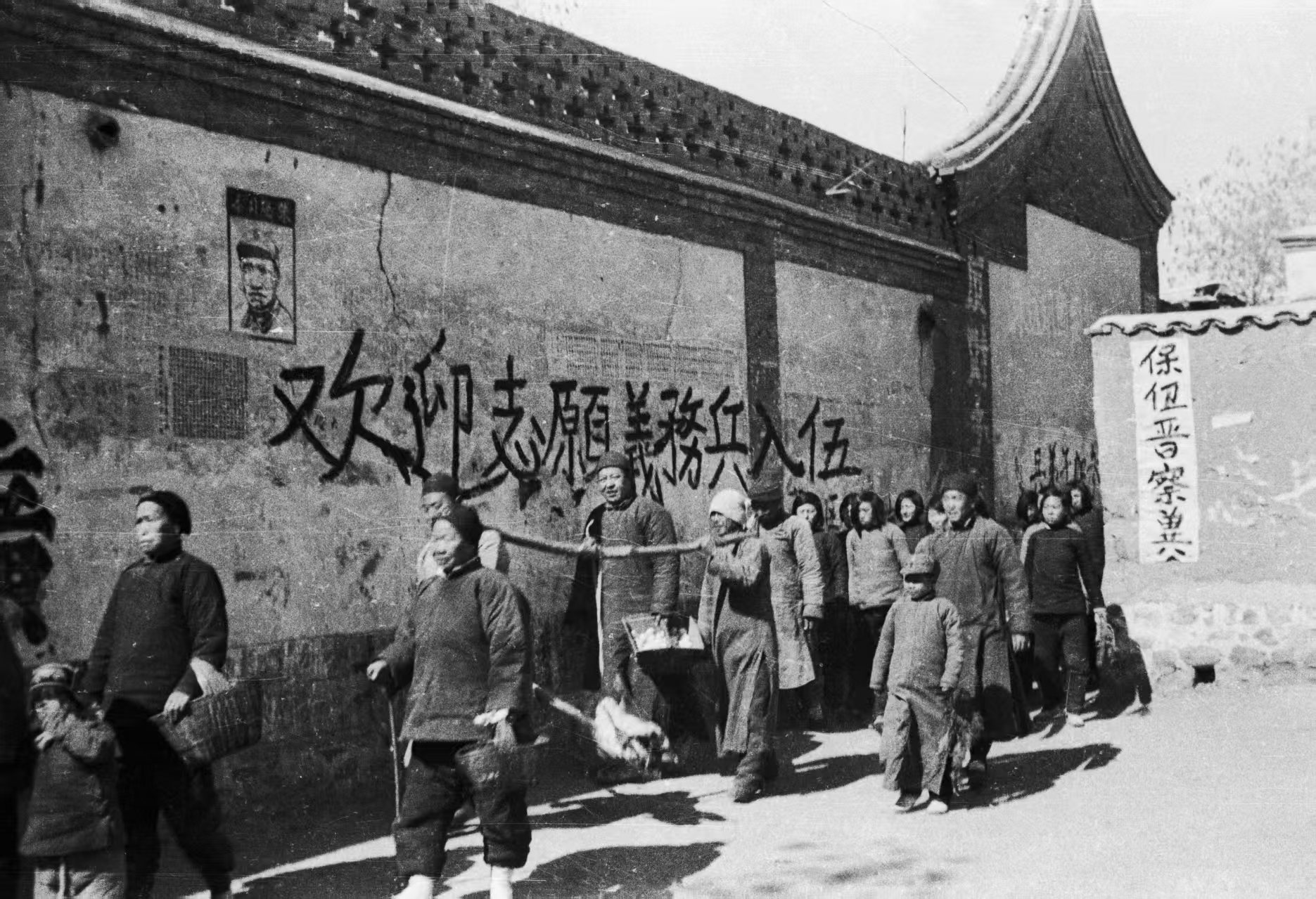 ▲ 1942年3月,北庄村村民欢送平山青年参加志愿义务兵,欢送队伍正带着慰军物品经过开明士绅齐学韶家的大院。《晋察冀画报》 沙飞 摄