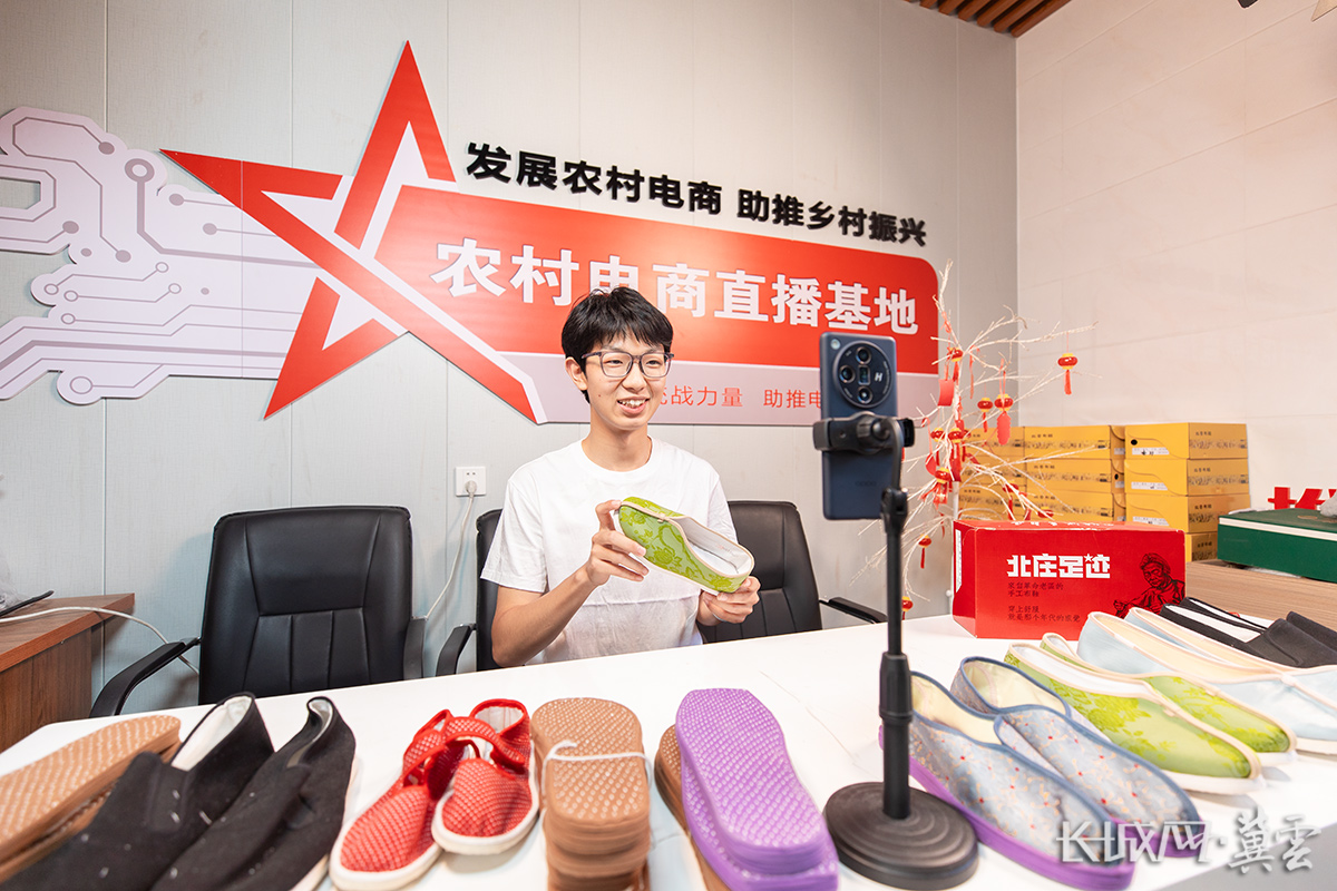 ▲ 2025年8月13日,“团结手工坊”的网络主播王梓杰正在直播带货,将村民们手工缝制的布鞋、鞋垫销往全国各地。长城网·冀云客户端记者 庞晓玮 李皓 摄
