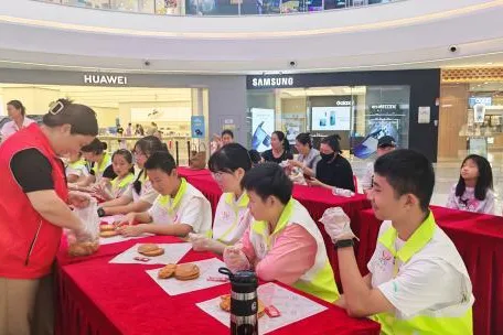活动期间,团市委联合市同心青少年志愿服务中心在万达广场组织开展“小橘灯”残健融合——手工DIY汉堡活动。“湖小荷”志愿者们与特殊儿童结对分组,折翼天使们在志愿者的引导和帮助下摆放面包、夹生菜、涂抹酱料、放肉饼。志愿者们通过温暖的话语和真诚的互动,为帮扶对象传递鼓励与支持。
