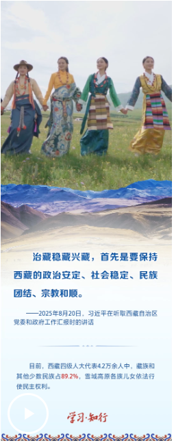 2025年8月20日,习近平总书记率中央代表团乘专机抵达拉萨,出席西藏自治区成立60周年庆祝活动。在听取西藏自治区党委和政府工作汇报时,习近平总书记强调,“持续深入抓好稳定、发展、生态、强边四件大事,努力建设团结富裕文明和谐美丽的社会主义现代化新西藏”。