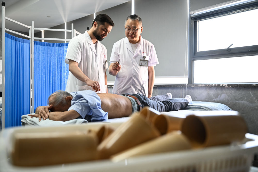 南京中医药大学2023级针灸推拿专业的硕士研究生阿米尔中来自塔吉克斯坦首都杜尚别。中学时,他爱上了中国文化,给自己取了个中文名字“李小龙”。长期学习中文的他,后来多次来到中国,并与中医结缘。2015年,李小龙来到北京中医药大学学习针灸推拿,毕业后回到杜尚别,开设了一家中医诊所。2023年,李小龙又来到南京中医药大学攻读硕士研究生,精进医术。这是2025年4月18日,在南京中医药大学第二附属医院针灸康复科,李小龙(后左)在导师张建斌指导下给患者行针。